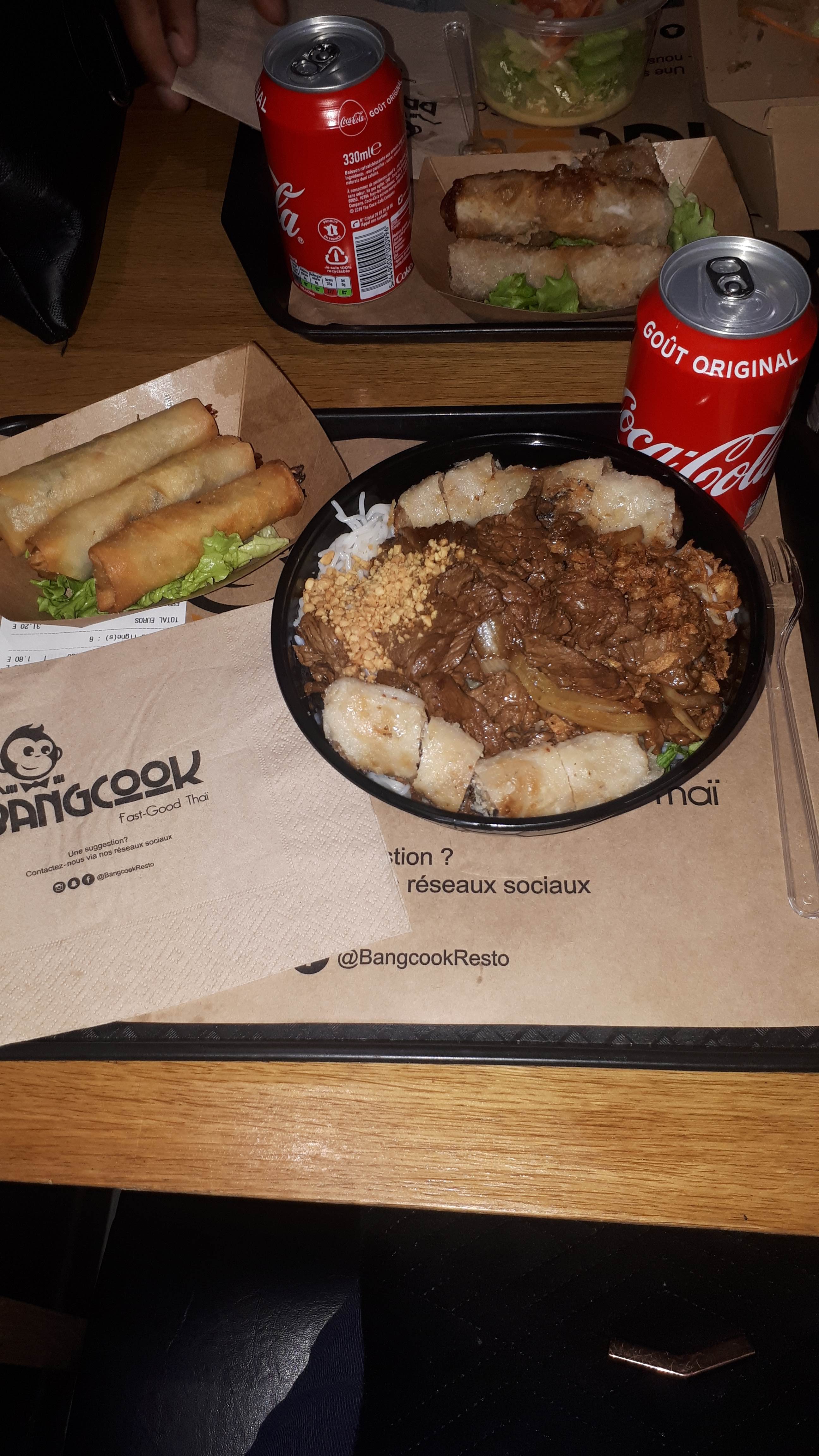 Je suis extrêmement déçu par la qualité des plats. Client de Bangcook depuis son ouverture, j’ai remarqué une nette baisse de qualité au fil du temps. J’ai commandé un lok lak bœuf : la viande était élastique, comme du caoutchouc. Mon ami a choisi un curry vert qui manquait totalement de saveur et avait une consistance beaucoup trop liquide. Quant au pad thaï, il était bien trop salé. Pour couronner le tout, les nems ont été servis sans sauce, et le supplément de sauce dynamite que j’avais commandé n’a pas été livré. Je ne compte plus revenir ni recommander cet établissement tant que la qualité n’aura pas retrouvé son niveau d’autrefois.