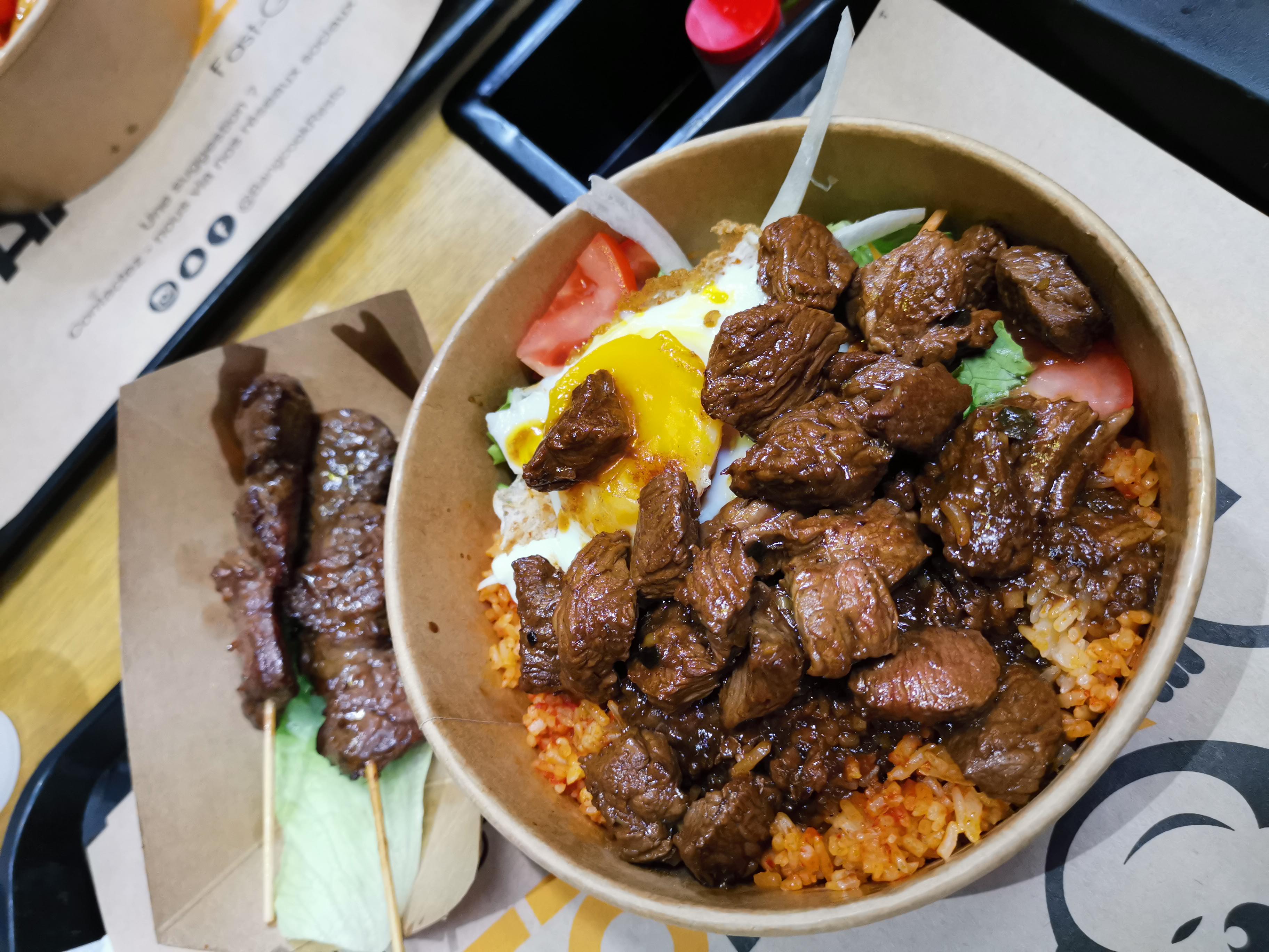 Posté le 20/03/2019 à 20:33"Les point positif assaisonnement du riz et de la viande extrêmement bon ! Par contre il y avait 2/3 morceaux de viande dur a mâcher comme si c'était du chewing-gum sinon c'était vraiment bon mais pour 11 euros sans boisson on a pas droit a l'erreur et de plus la quantité laisse vraiment a désirer en gros pour 11 euros ta un peu de riz avec un peu de viande certe bien assaisonner mais on sort de la on a vraiment faim le riz ne coûte pas chere bordel"