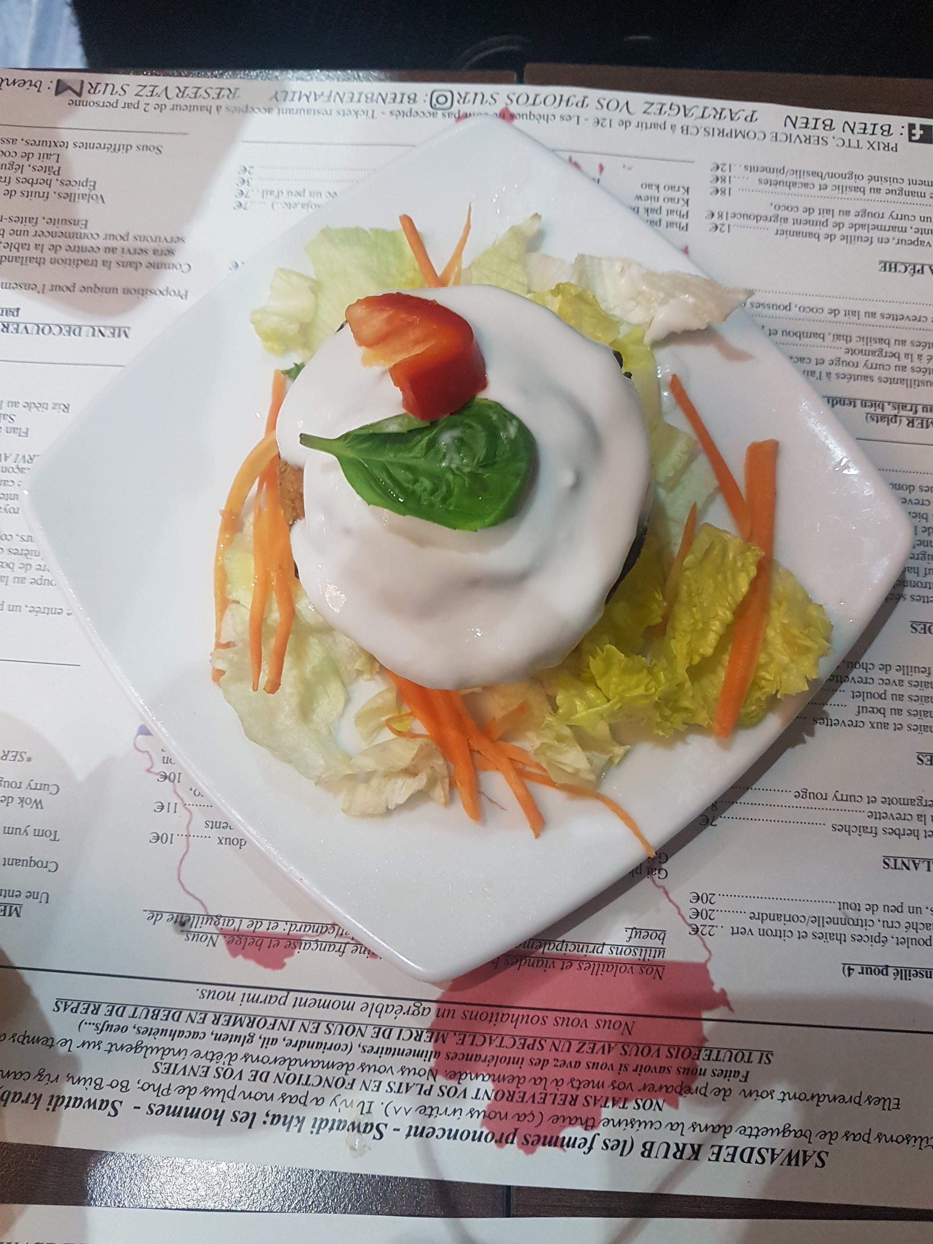 Posté le 02/11/2017 à 12:07"Le lieu est agréable et l'accueil vraiment sympathique. En entrée nous avons pris des rouleaux de légumes au taro délicieux, et des aumônières à la crevette qui étaient bonnes mais un peu chères par rapport au reste de la carte. En plat, nous avions un boeuf et un poulet sauté au basilic, bambou et piments doux (plus ou moins pimenté selon la demande), ainsi qu'un phat thai aux crevettes. L'ensemble était très bon (cf photos). Seule remarque, le phat thai est indiqué dans les garnitures, et il est effectivement un peu petit (ce qui justifie son petit prix de 8€). J'y retournerai avec plaisir."