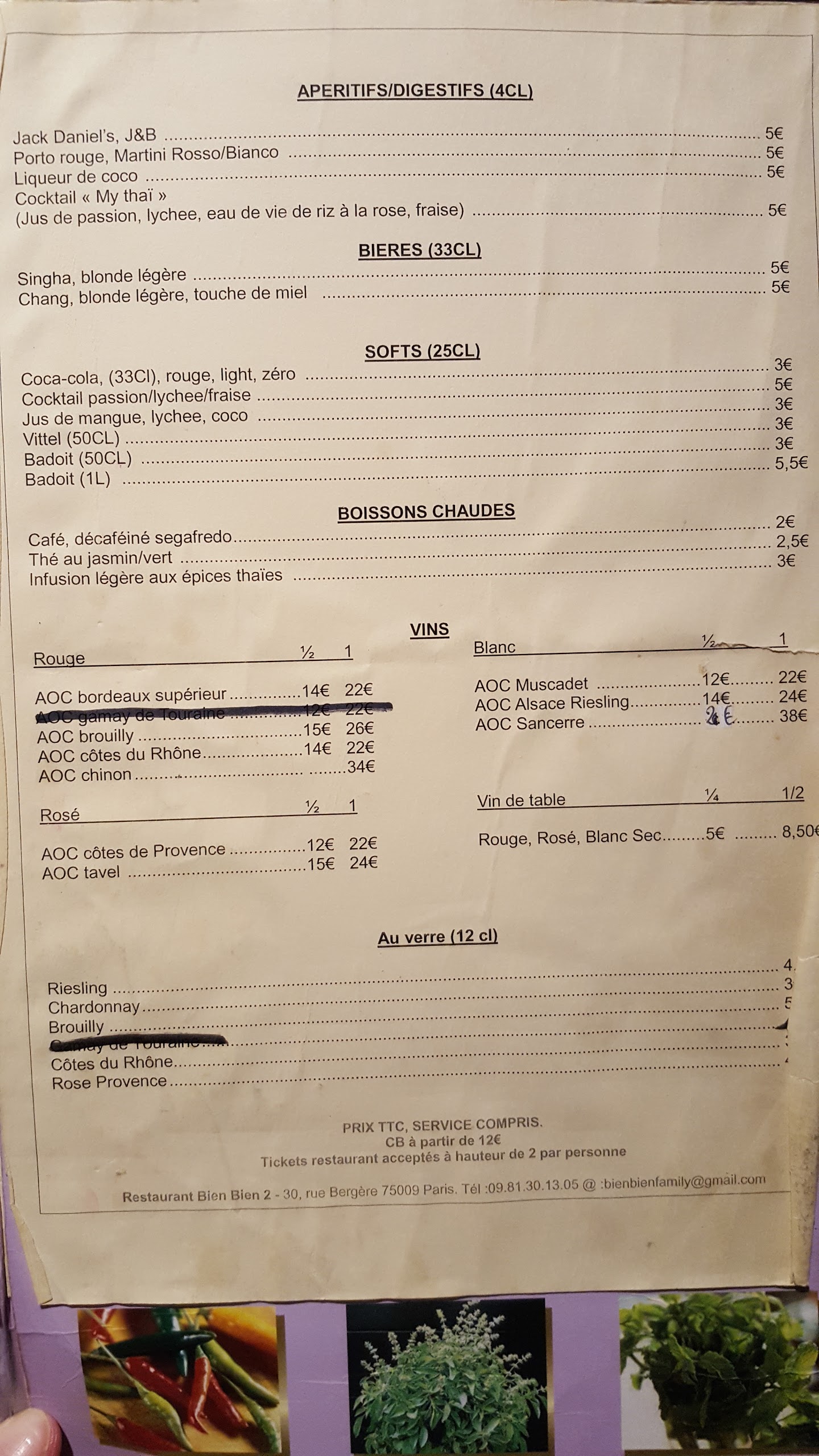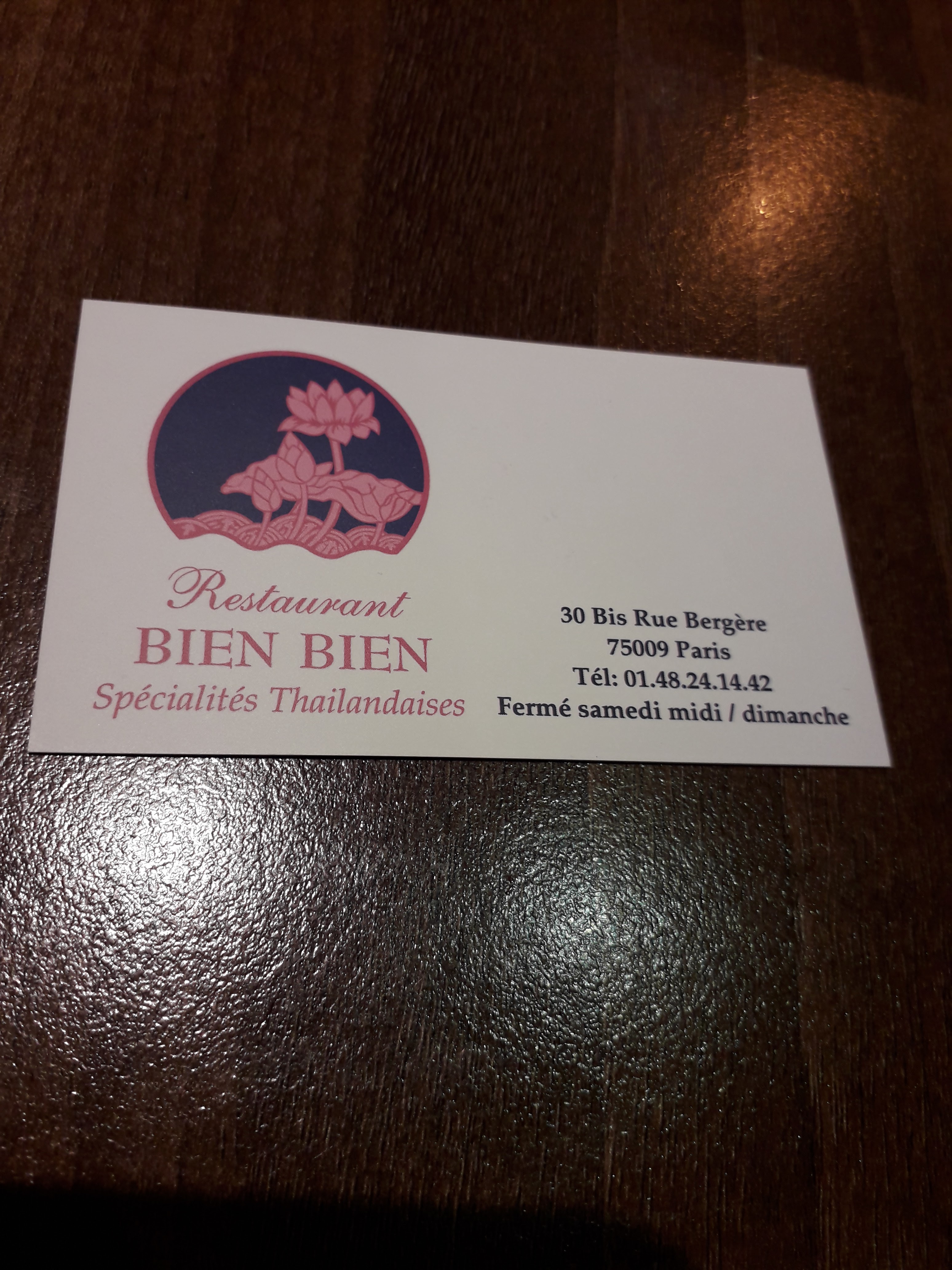 Nous étions au Bien Bien 2, samedi avant de nous rendre au théâtre et ce petit restaurant thaïlandais fût un ravissement pour notre palais ..plats excellents (comme ceux que j'ai découvert en Thailande ) et mangue délicieuse. Service très rapide et serveur (patron ) absolument charmant de a à z avec nous. On reviendra et on conseille vivement.