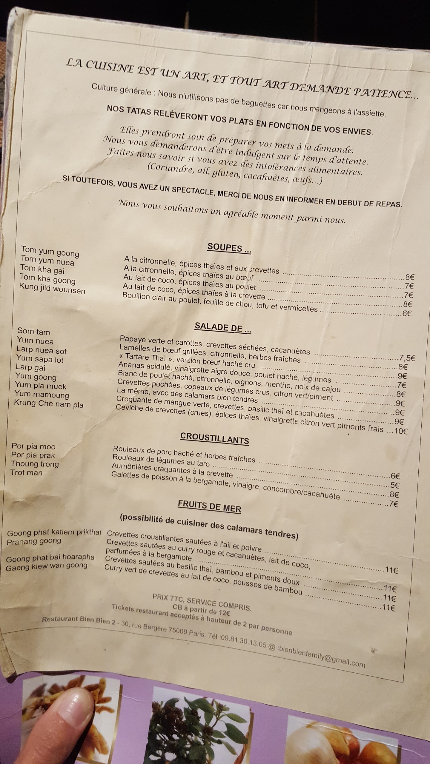 #Top10. Un des meilleurs restaurants thaï de Paris dans mon Top 3, les prix sont un peu chers mais la cuisine est vraiment très bonne et l'équipe très sympathique. Institution évidente de la cuisine thaïe sur Paris > c'est toujours bondé, il vaut mieux réserver pour être sûr de pouvoir avoir une place > (Le Bien Bien 2 pas très loin permet de continuer à espérer trouver une place). (Classement Thaï à Paris : N°3).