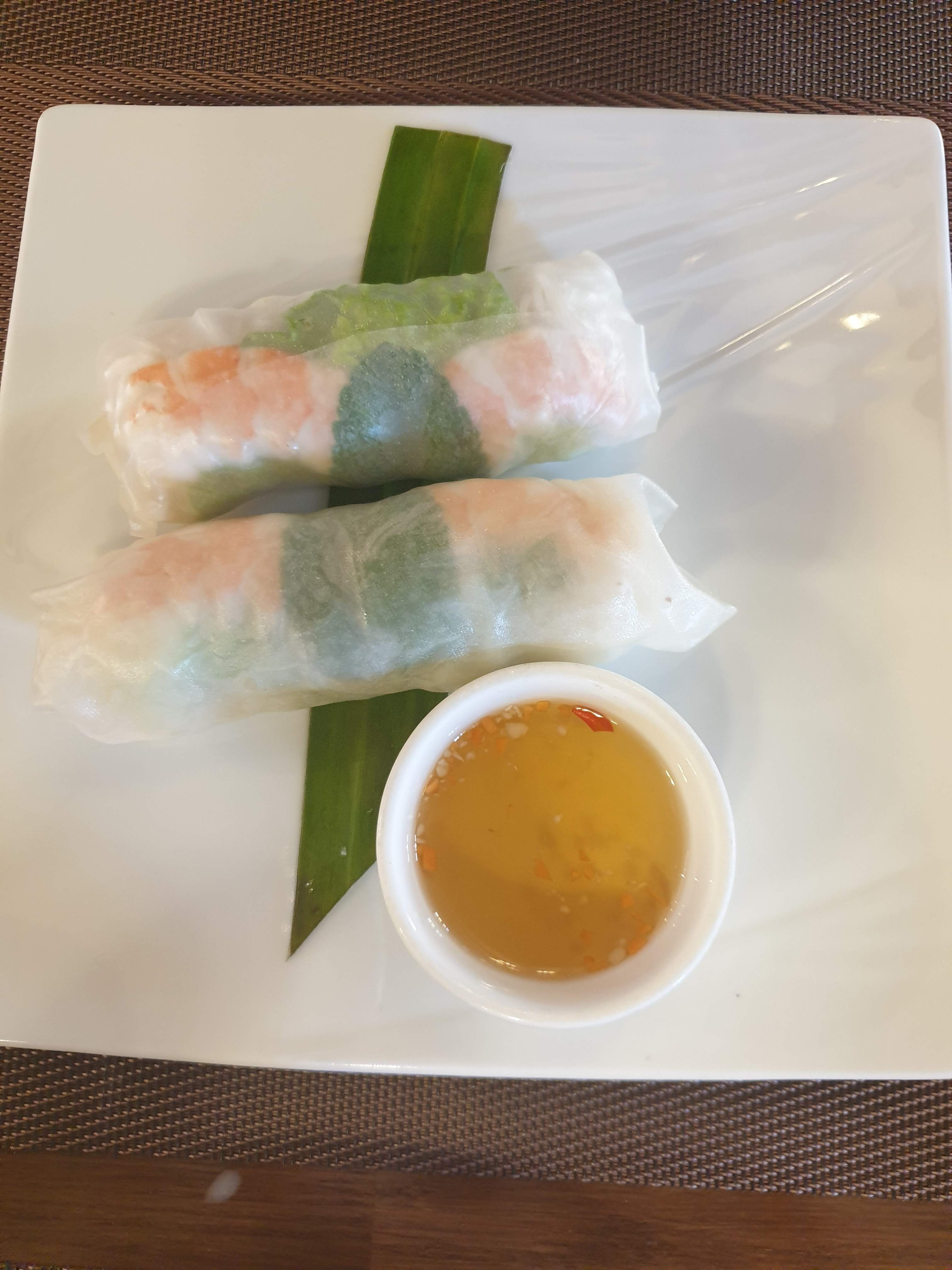 Soupes crevettes à la citronnelle très goûteuse, raviolis grillés au poulet bons mais pas assez chauds. Le bar était bien frais. Je recommande ce restaurant.