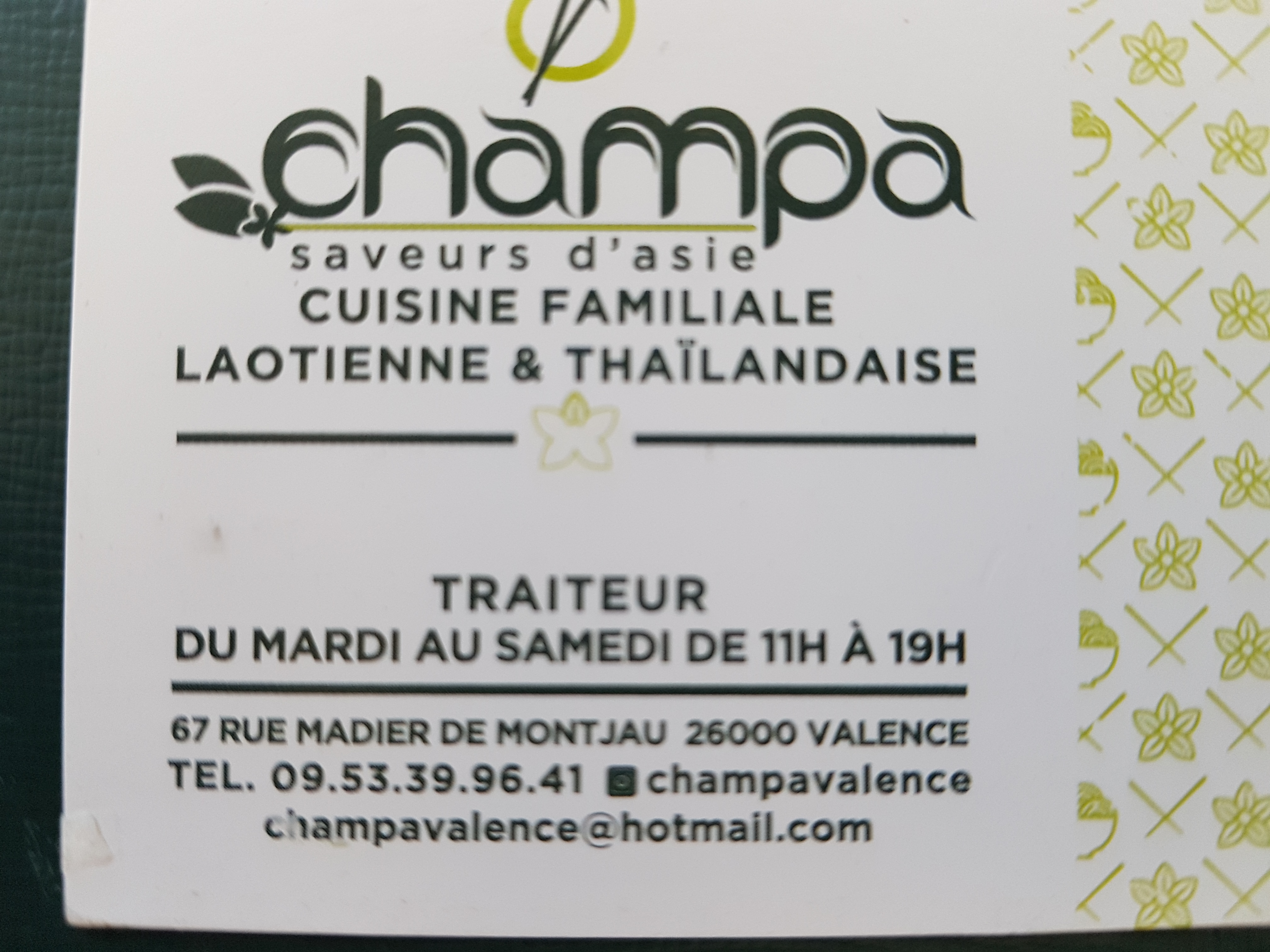 Voici toutes les informations sur le Restaurant thaï Champa Saveurs d'Asie qui ce trouve au 67 Rue Madier de Montjau, 26000 Valence (26). Sur cette fiche vous trouverez les photos, l'adresse, les horaires d'ouverture, le numero de téléphone et les avis clients.Vous pouvez églement rédiger un avis si vous le souhaitez en bas de page.