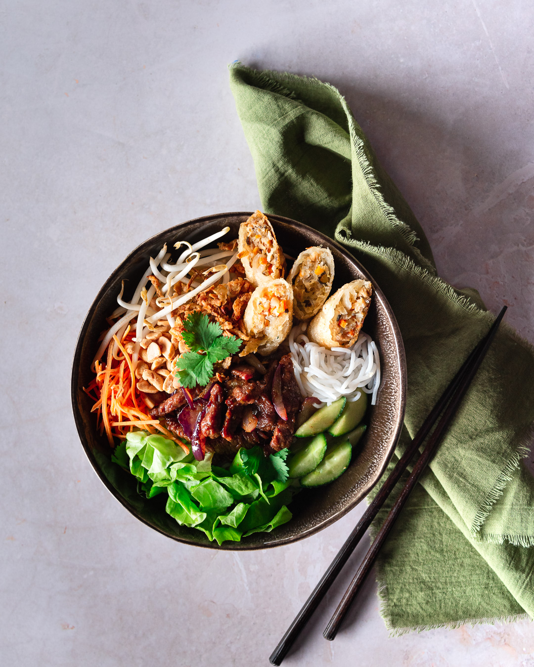 Je n'ai pas eu ce que j'avais commandé à emporter, je m'en suis rendue compte chez moi, la salade toute simple (salade carottes poulet frit) a la place du bobun que j'avais pris avec un supplément donc pas le même niveau de prix Les nems sont bons, c'est dommage