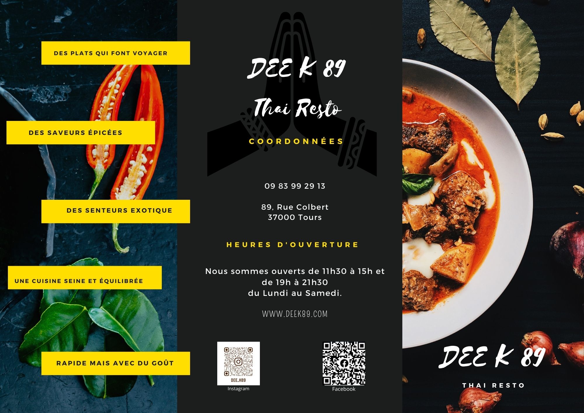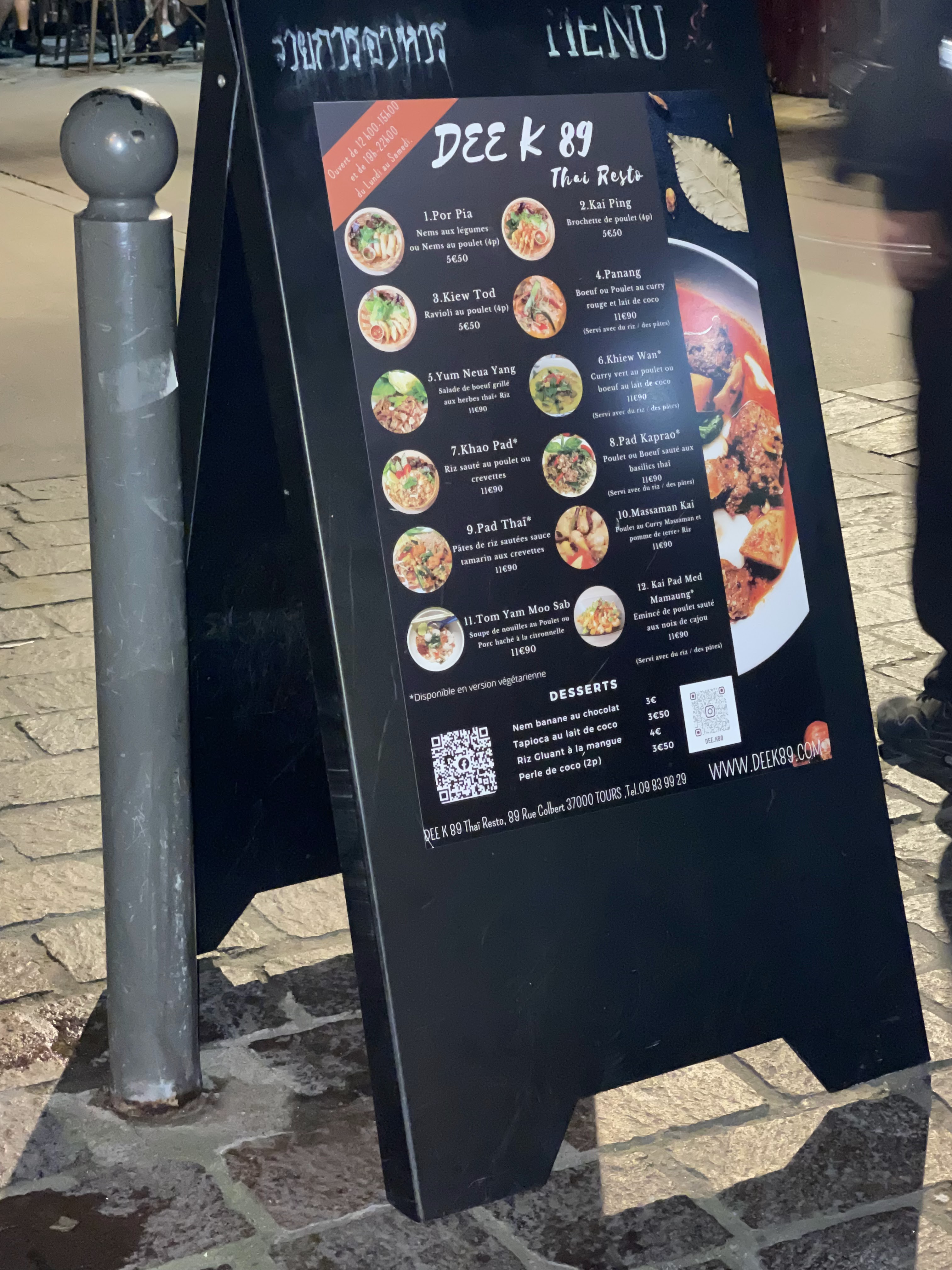 Voici toutes les informations sur le Restaurant thaï DEE K89 qui ce trouve au 89 Rue Colbert, 37000 Tours (37). Sur cette fiche vous trouverez les photos, l'adresse, les horaires d'ouverture, le numero de téléphone et les avis clients.Vous pouvez églement rédiger un avis si vous le souhaitez en bas de page.