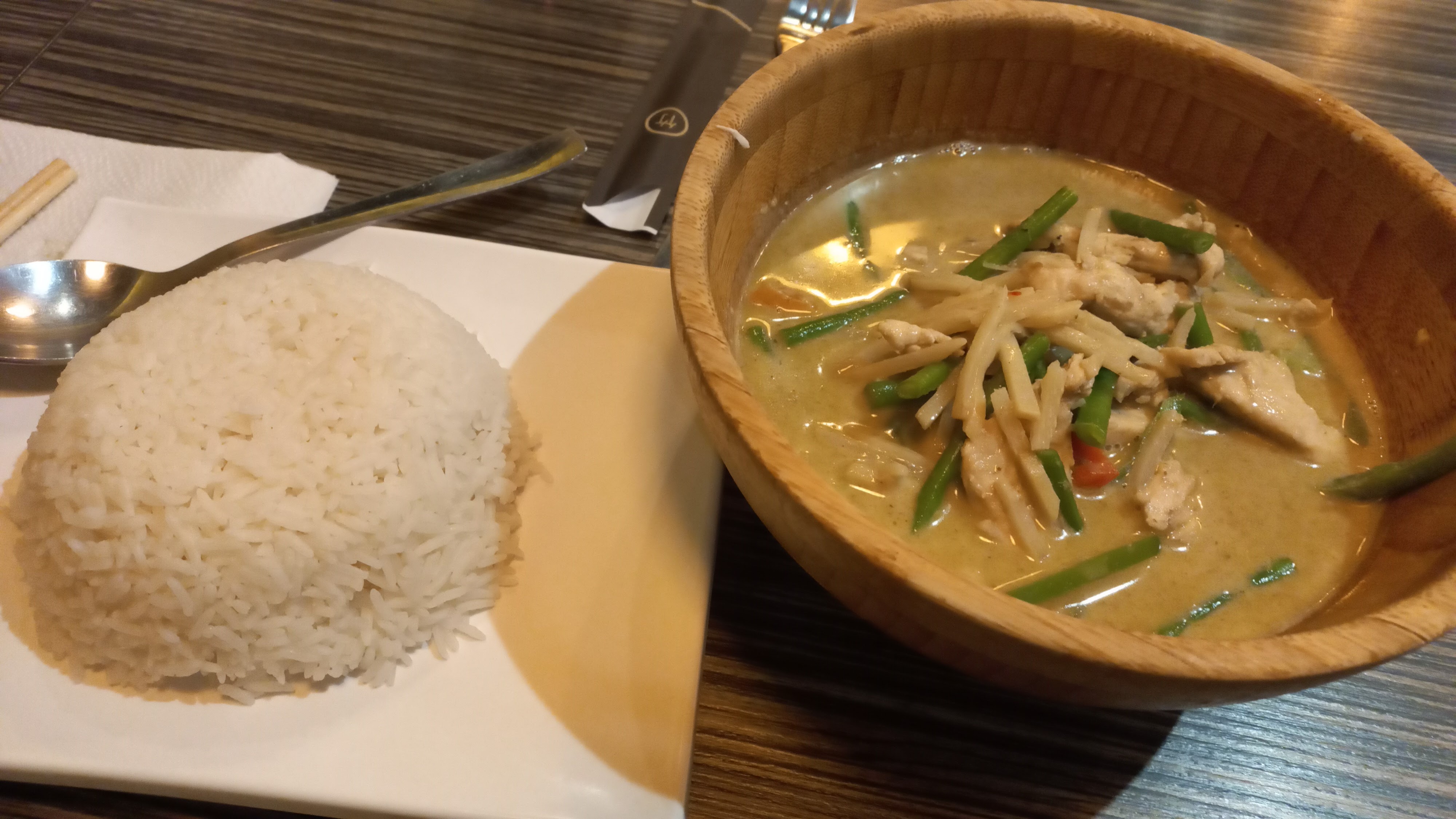 Nourriture excellente ! Je n'ai pas vu de différence avec la nourriture que l'on peut manger en Thaïlande , ça fait voyager ! Personnel au petit soin et service très rapide . Plat très tcopieux !
