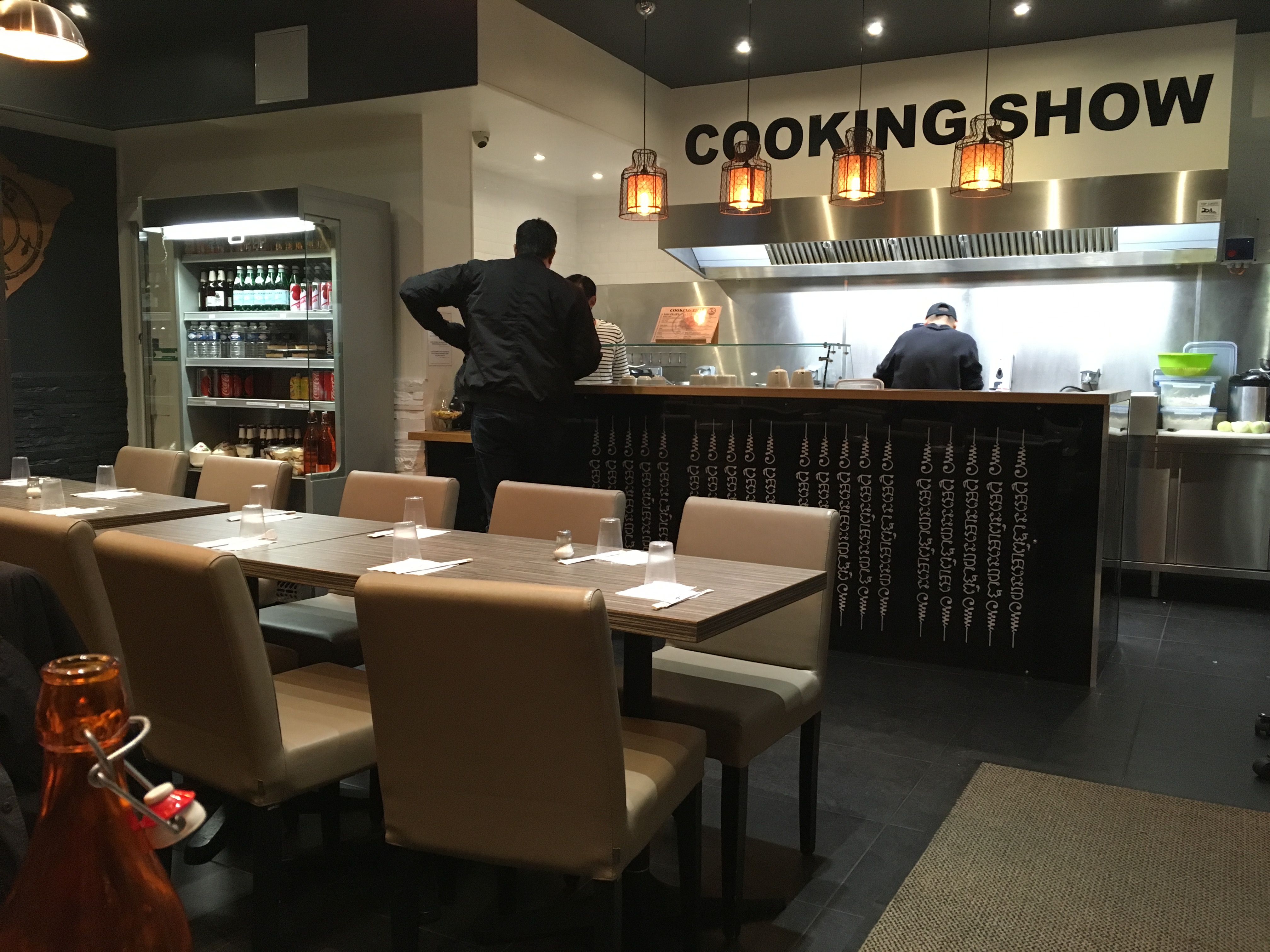 Des plats corrects cuisinés minutes au wok devant vous. Des recettes simples mais qui fonctionnent. Manque peut être un peu d authenticité (un peu trop occidentalisé). Plats très (trop?) copieux pour les gros mangeurs (bcp de nouilles et riz assez peu de viande). Mais rapport qualité prix très correct