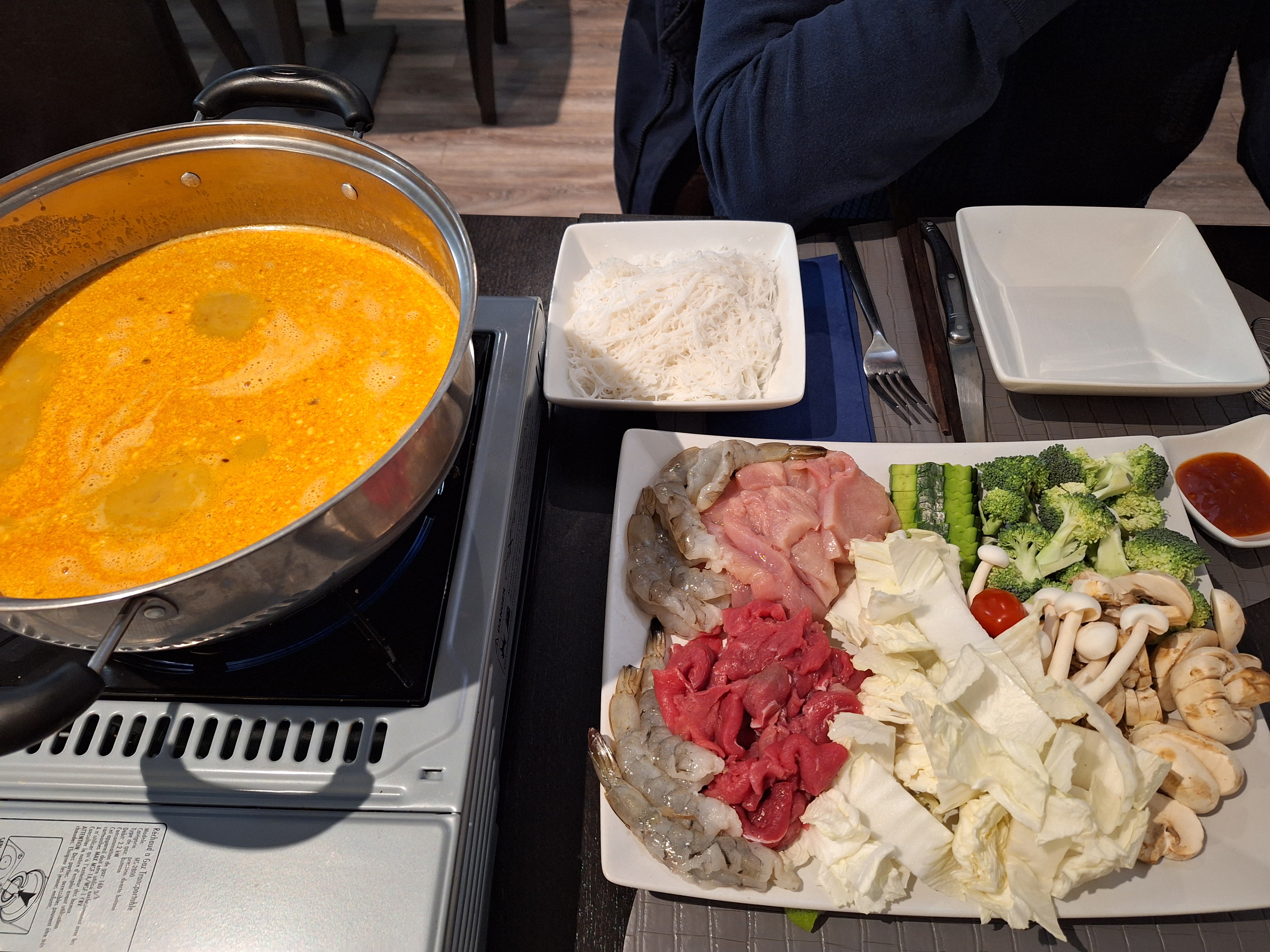 Nous avons déjeuner samedi avec mon mari pour fêter nos 20 ans de mariage. Nous avons commandé la « fondue thaïlandaise » que nous ne connaissions pas et nous n’avons pas été déçus! Les légumes et la viande trempés ou marinés dans le bouillon sont un vrai délice! Le service et l’accueil du personnel était tout simplement excellent! Nous avons prévus de revenir avec nos amis très prochainement.