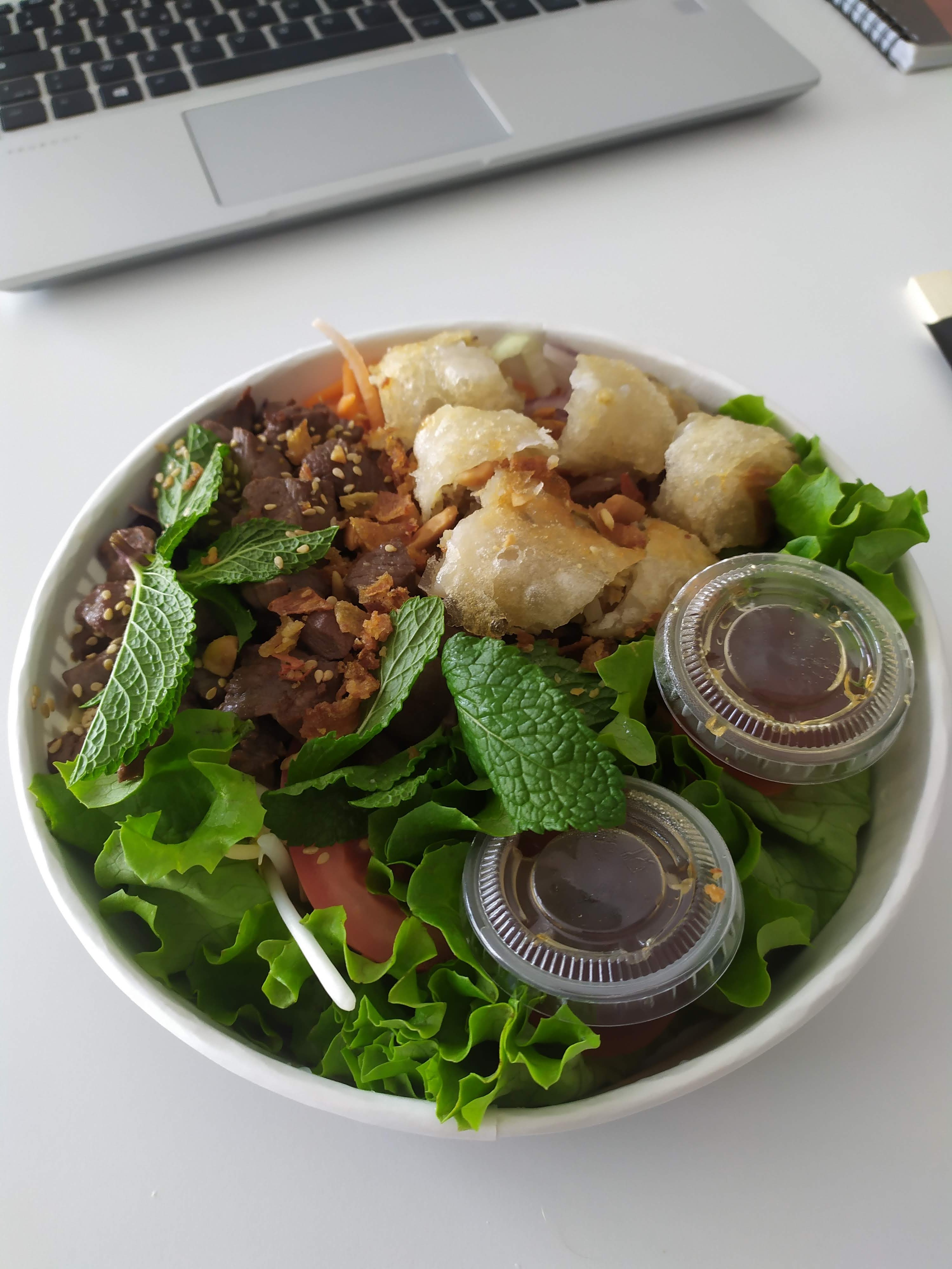 J'ai pris un bo bun qui était très copieux avec beaucoup de salade verte et de nouilles. Je cherche toujours les oignons frits ainsi que les herbes aromatiques à part la menthe pour les nems je pense. Ça manquait de saveurs. Comme c'est la 1ère fois, je vais réessayer