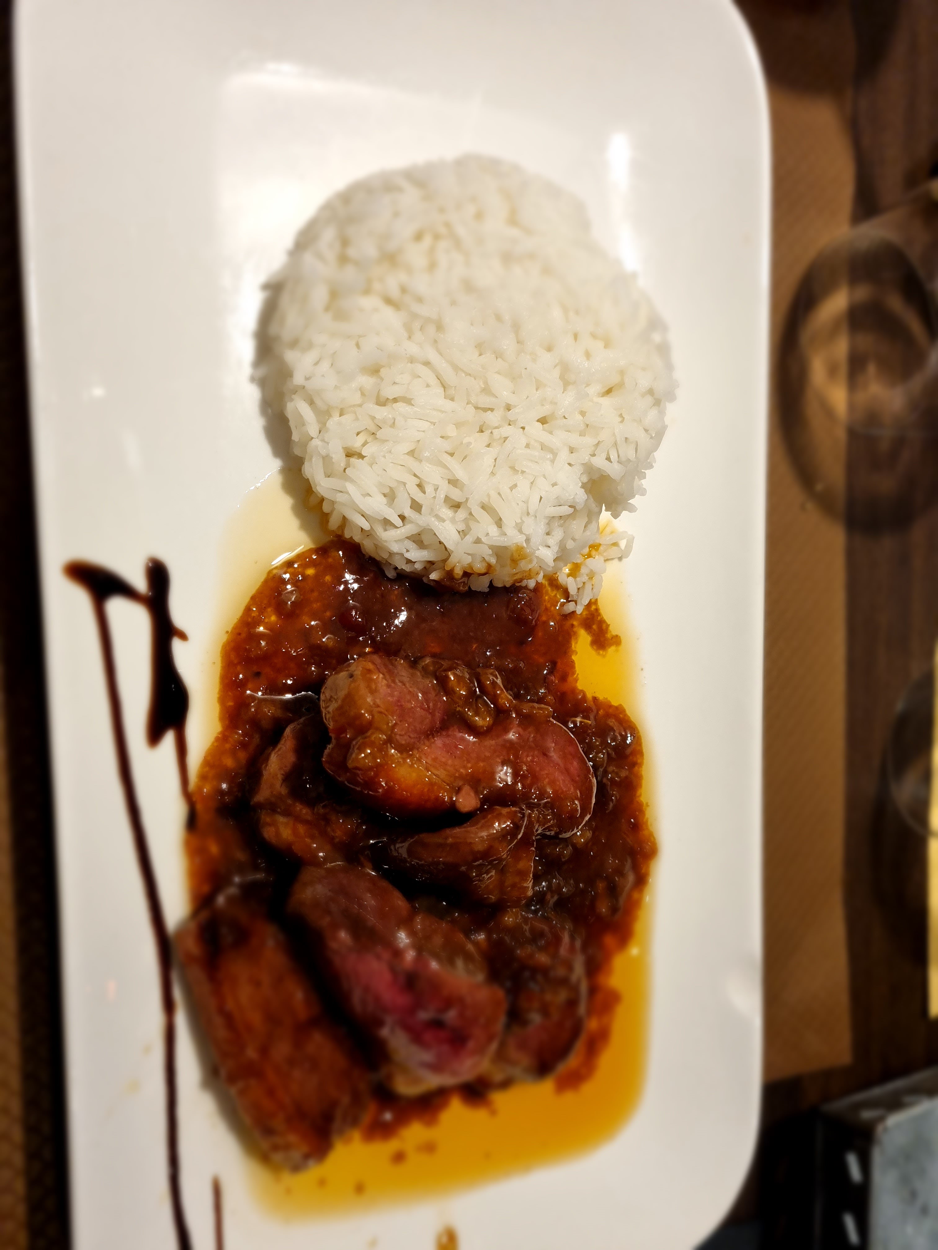 Trois beaux nems servis sans feilles de menthe avec la salde. Dommage, un morceau de canard était archi cuit comparé aux autres morceaux qui étaient, eux saignants. Sauce à base de crème fraîche, ce qui donne un plat beaucoup trop riche avec la graisse du canard fondu. Plat épicé mais non spécifié. Je n'ai pas retrouvé le goût asiatique que j'aime tant. Entrée plat 24€ quantité moyenne de riz.