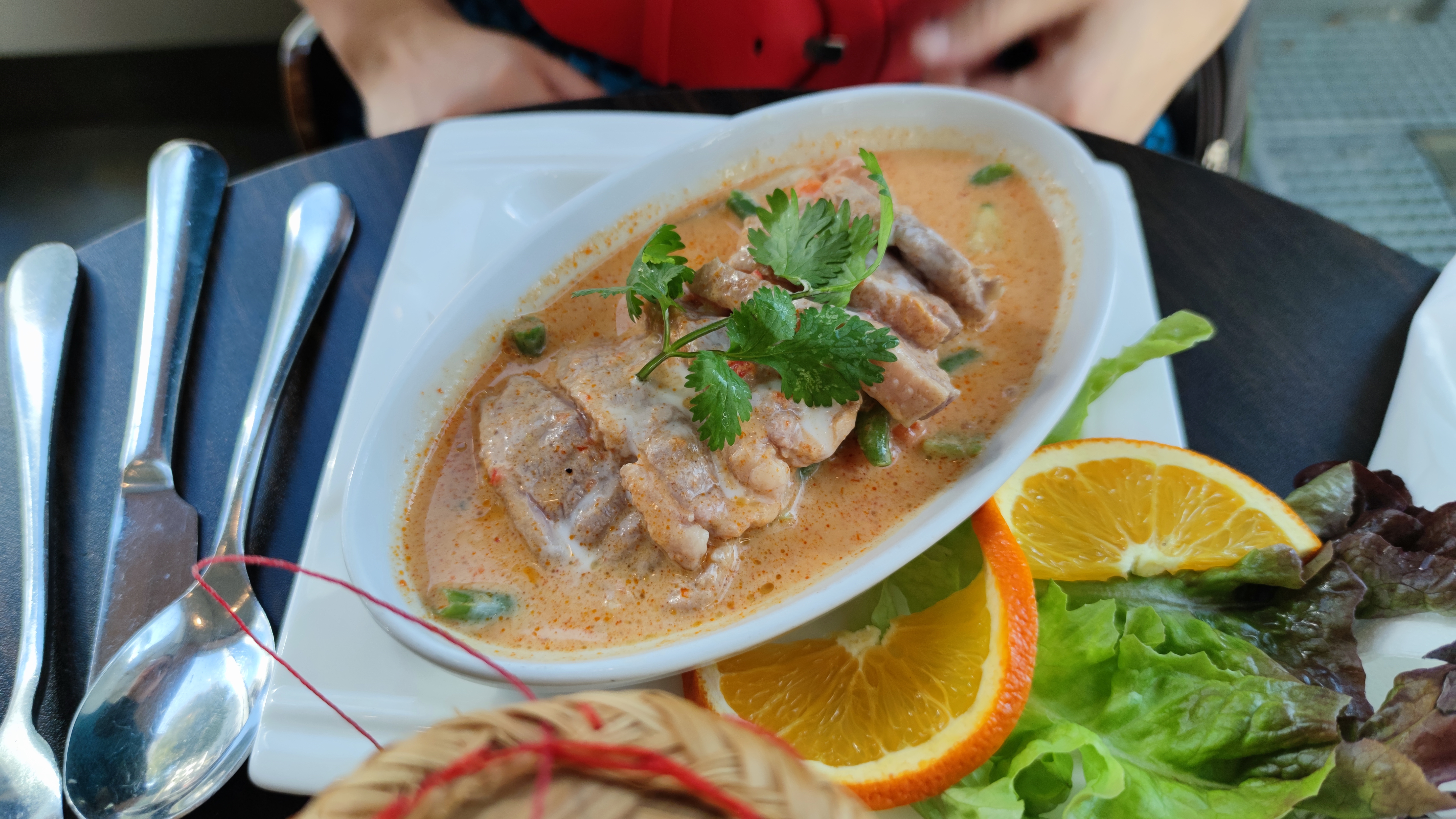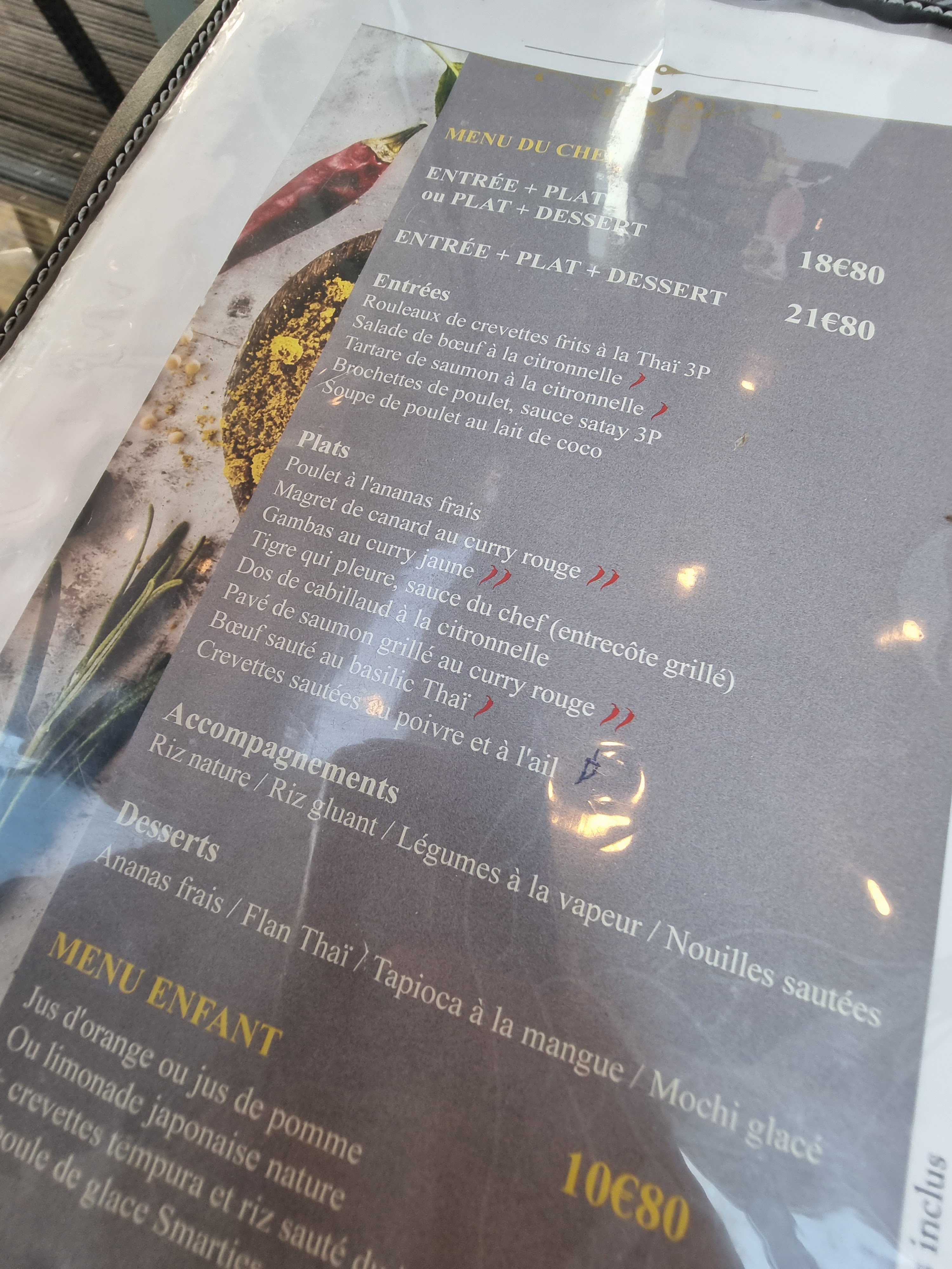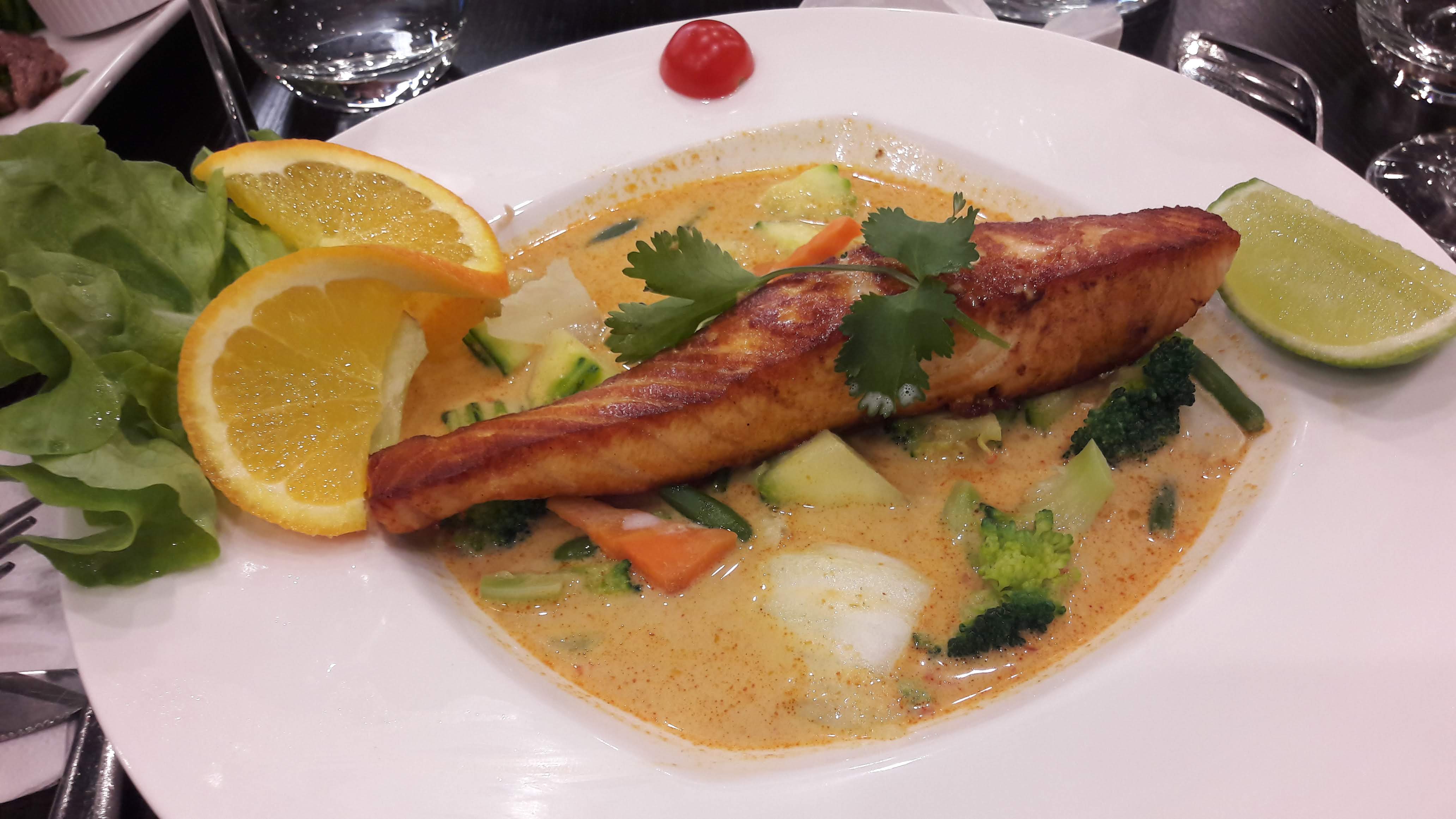 Cette fois-ci on ne s'est pas régalé .. On a pris le menu Entrée/Plat du soir- salade de bœuf thaï - Bœuf mariné sur un lit de salade avec un filet de citron, pas mauvais, mais le plat pas terrible. Magret de canard au curry rouge, 3 morceaux de viandes bouillis dans une crème toute liquide avec du curry et légumes. Plus de légumes que de viandes dommage .. Viande impossible à couper, car du caoutchouc et les légumes sans goûts ni assaisonnements. Non vraiment pas terrible ..