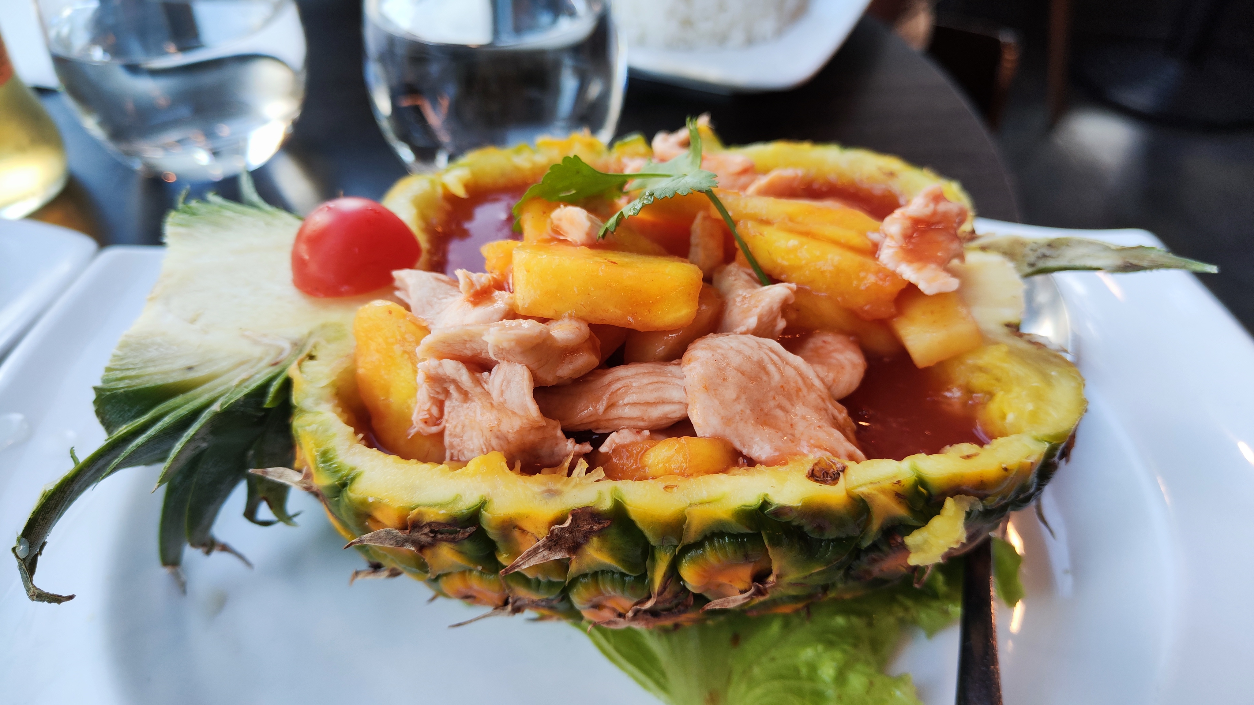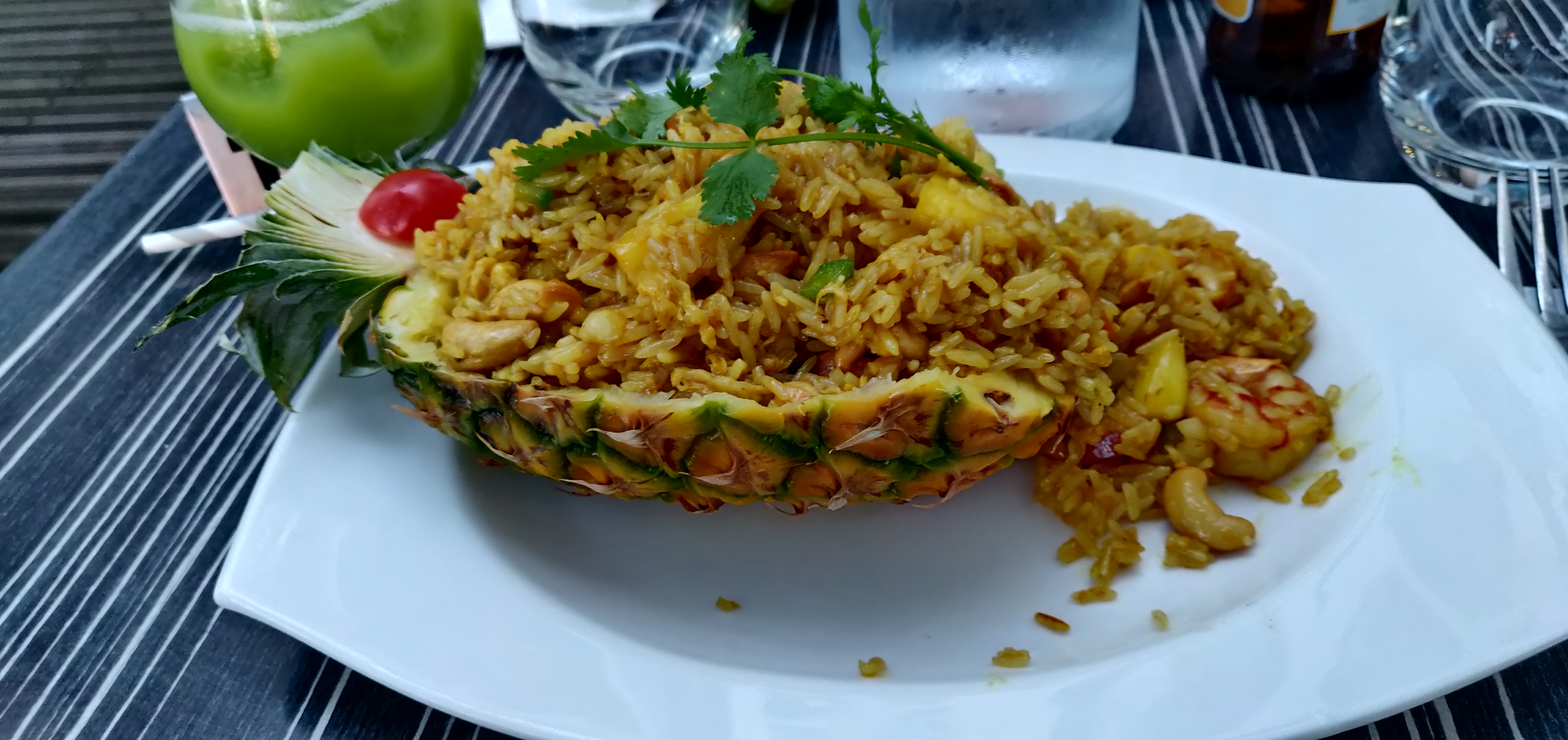 Très bonne surprise que le riz sauté aux crevettes et à l'ananas... Servi dans un demi-ananas !!!