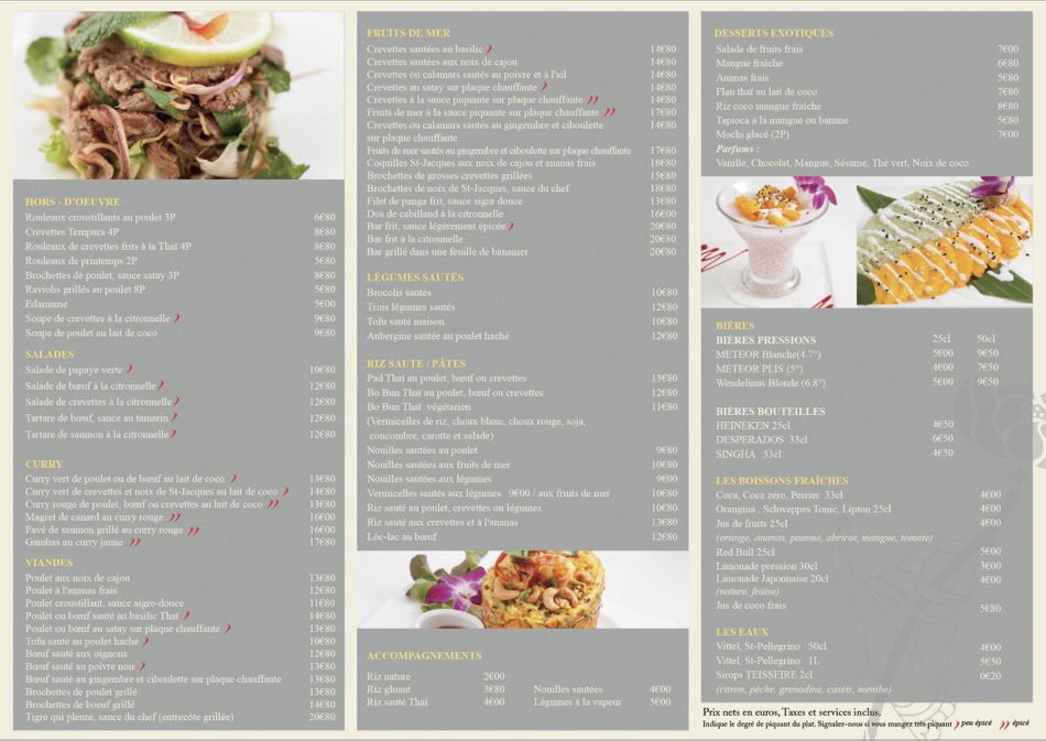 Le concept de cuisine thaï en mode brasserie française ne m a pas convaincu. J ai pris le dos de cabillaud a la citronnelle, avec des légumes vapeur. Le poisson n était pas tendre, il baignait dans un bouillon que j ai trouvé extrêmement salé . Les légumes vapeur avaient une apparence très surgelés, et n étaient pas suffisamment cuits. Ils étaient accompagnés d une sauce elle aussi très salée et qui ne s accordait pas avec le bouillon du poisson. Côté service rien à dire. Côté addition les prix sont corrects en prenant un menu. Côté décoration, le restaurant manque de cohérence, des zèbres marouflés , côtoient des bustes de cerfs en 3d, au milieu de vitrines pleines de bouteilles de bordeaux, avec une fausse bibliothèque en mezzanine... Bref expérience decevante.