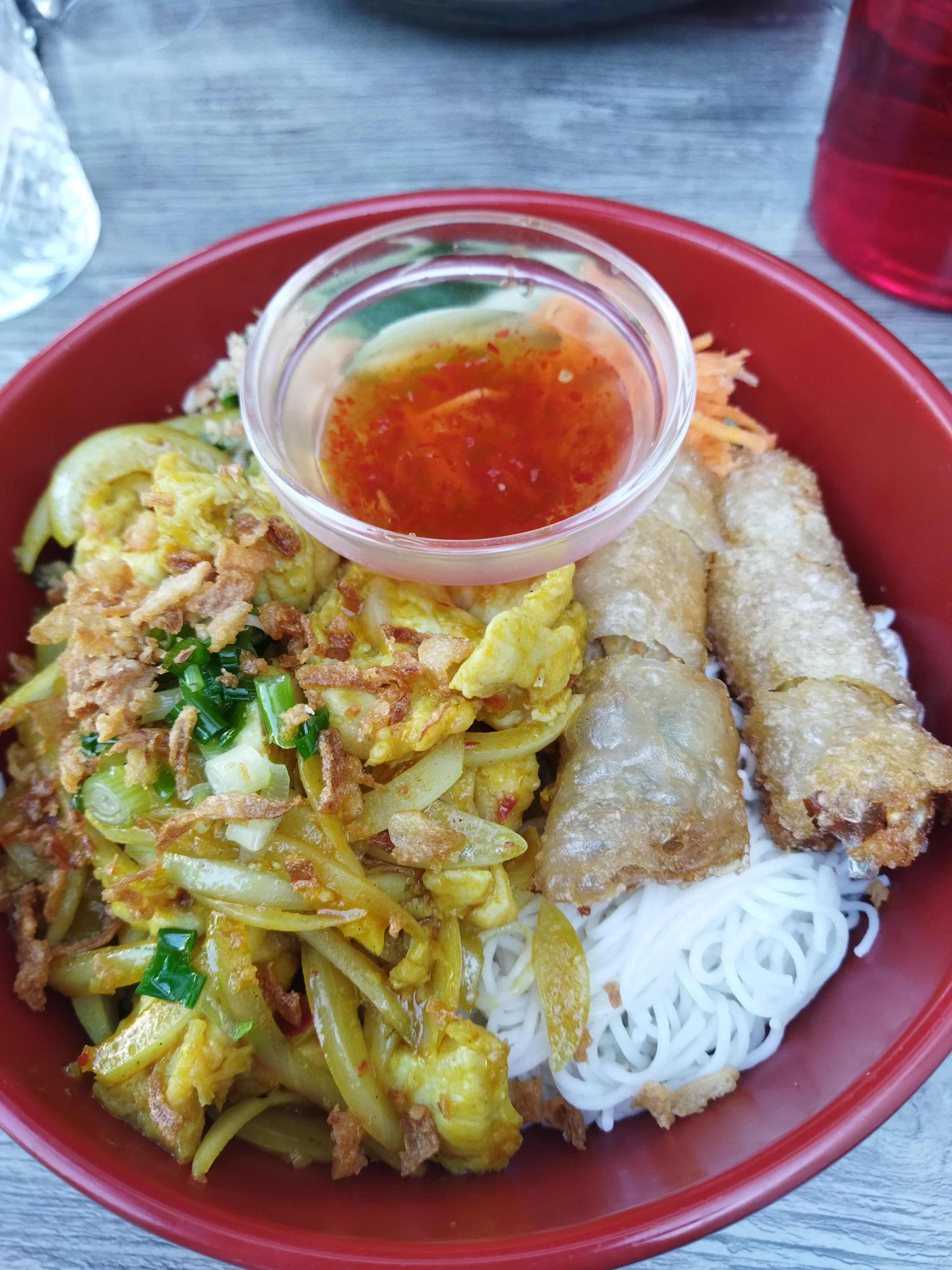 Quelle belle découverte ! Cela faisait des années que je voulais le tester . Nous avons mangé ce vendredi soir sans réservation , nous étions 2 , nous avons réussi à avoir une table tout en nous précisant qu’il fallait qu’on soit parti à 21h30 , nous avions largement le temps et l’hôtesse était adorable . Nous avons pris des nems poulet qui sont excellent et j’ai succombé au bo bun crevettes . Le serveur avait l’air assez débordé . Nous avons reçu notre dessert et nous étions en train de le déguster vers 20h30 quand on nous pose l’addition et on nous demande de payer TPE en main en pleine bouchée … Étant de la restauration j’ai trouvé ça limite … je reviendrais car honnêtement c’est super bon … mais attention au faute de service … ( je prend pas la commande de vos plats maintenant le passe est plein … )