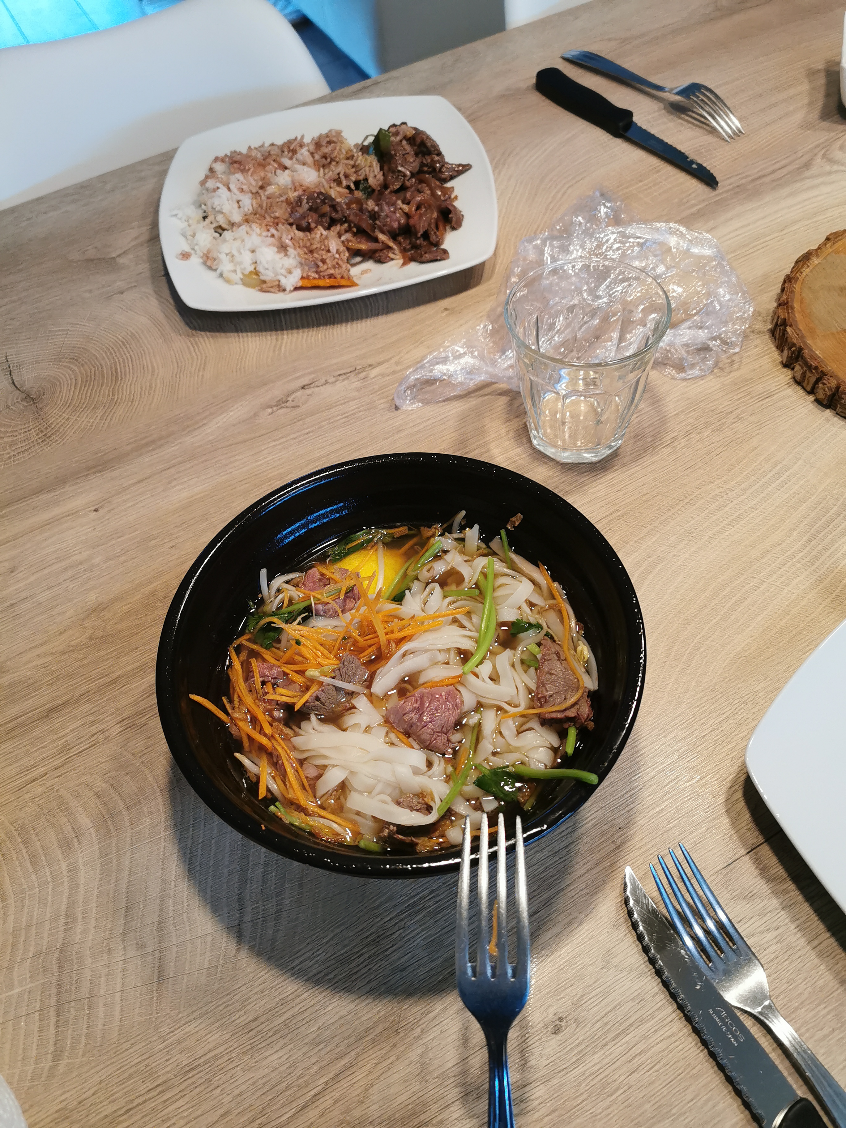 Pris à emporter bo bun (il manquait juste le bœuf... ) nouilles spéciales et nouilles crevettes , tout était excellent et copieux .le dessert moelleux choco- coco très très bon.