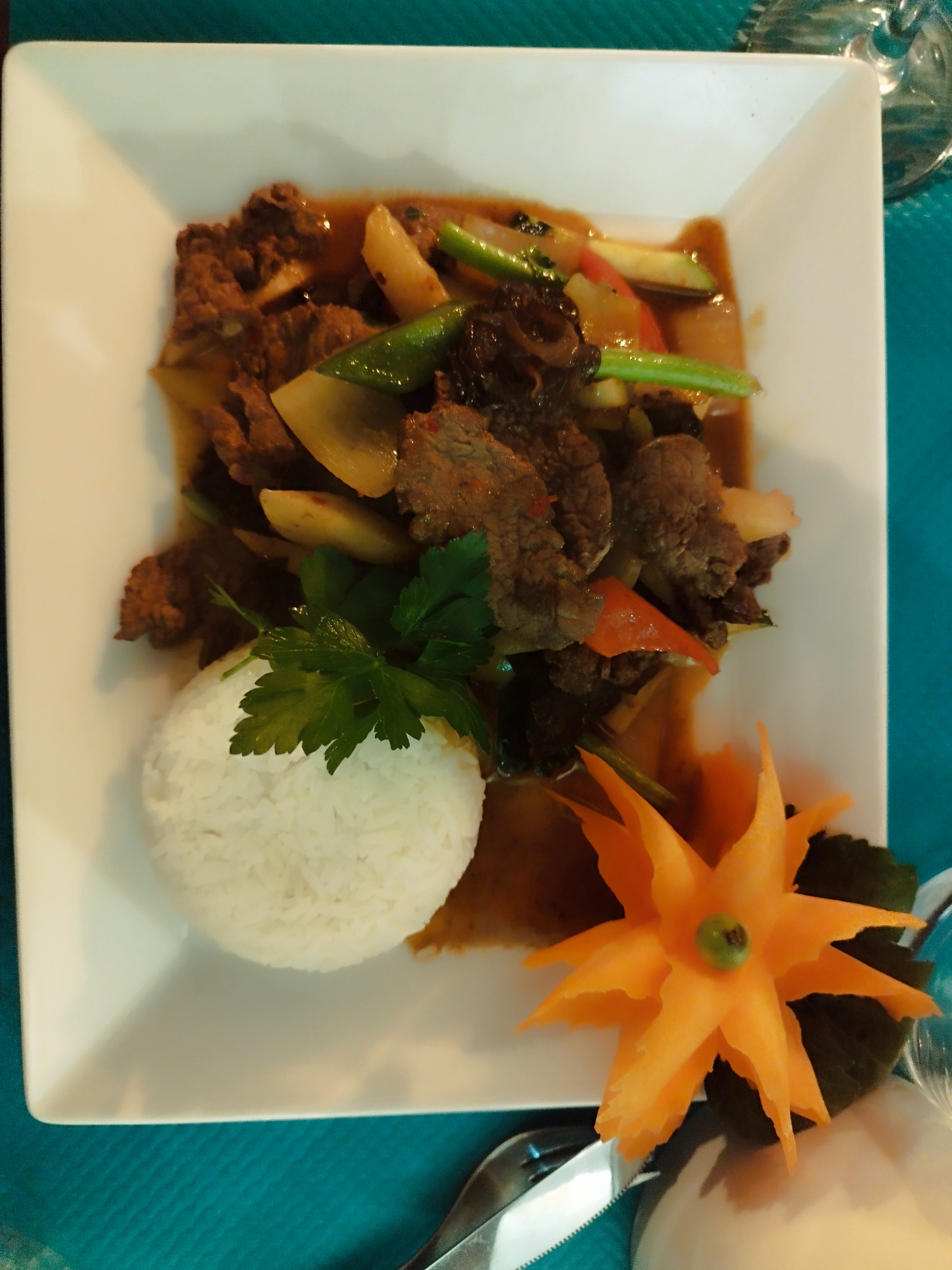 Très bonne adresse, avec un très bon accueil. Malgré le vent et une température un peu basse pour la saison, nous avons choisi de manger à l'extérieur, sous une tonnelle juste à côté de la piscine. Deux personnes dans le restaurant, une personne première qui vous accueille et vous sert et une deuxième personne, la cuisinière qui vous concocte ses savoureuses spécialités Thaï. Entrée, plat, café et une bouteille de rosé, 23 €/personne. On y retournera avec grand plaisir.