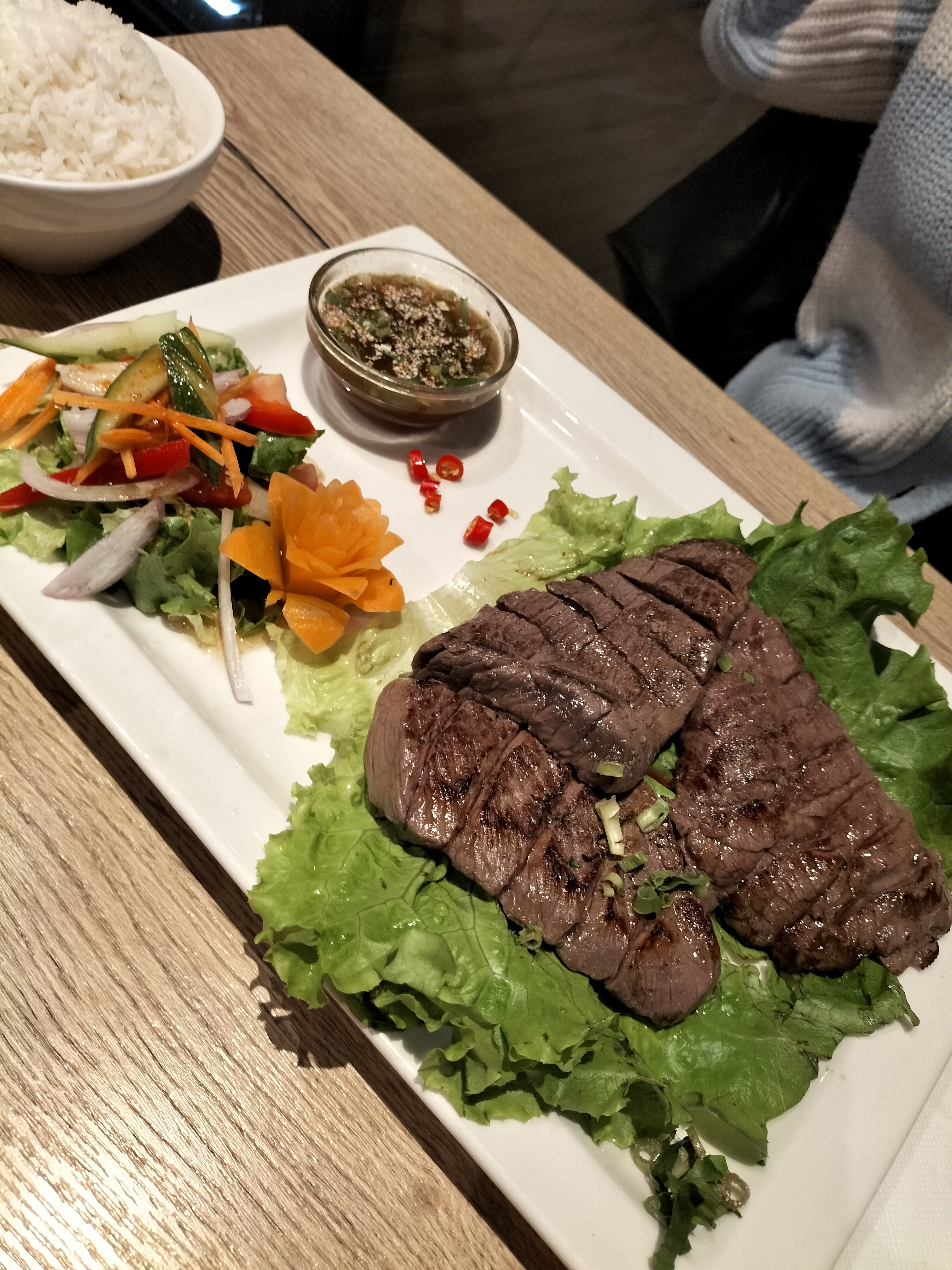 La soupe Tom kha, lait de coco et citronnelle est très bonne. En revanche, le tigre qui pleure était très moyen. La cuisson était trop cuite bien que demandée “à point”. La sauce était différente de ce que je connais habituellement, dommage ! L’endroit est propre et bien décoré. Les autres plats des invités avaient l’air bons. On donnera une seconde chance.