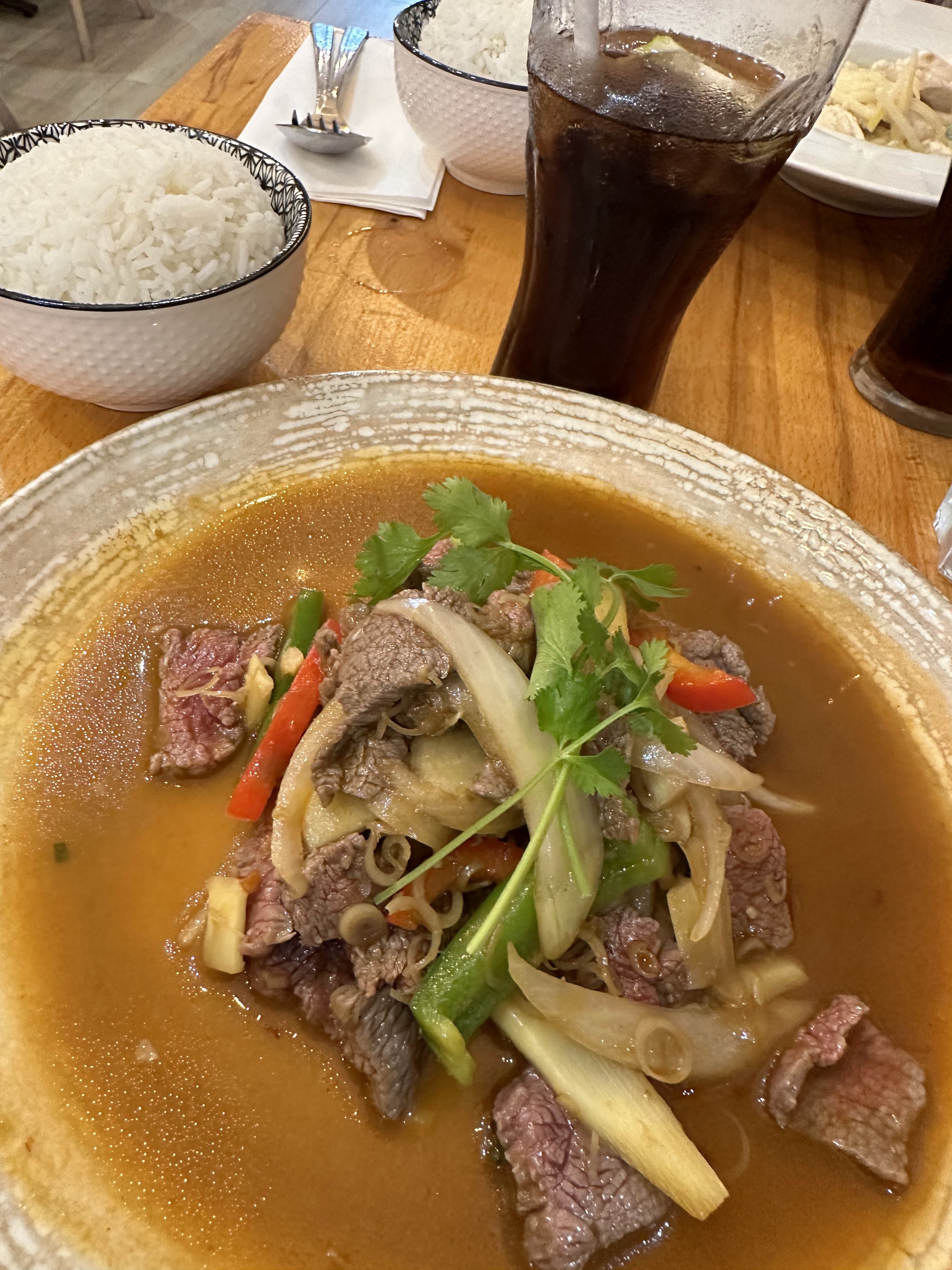 Gentillesse du service très attentionné et bonne cuisine thaï classique avec une carte variée. Pas de perturbation par les livraisons à domicile, cela fait du bien de revivre un dîner cool en salle. Un rapport qualité prix imbattable le midi et le soir. Le riz gluant est parfait ! La cuisine maison est bien faite, le piment bien indiqué, frais et bien dosé. J'ai bien aimé le curry vert de poulet, les nems variés, les soupes et le flan grillé 🍮 très gourmand. Pas encore goûté... Les pâtes.
