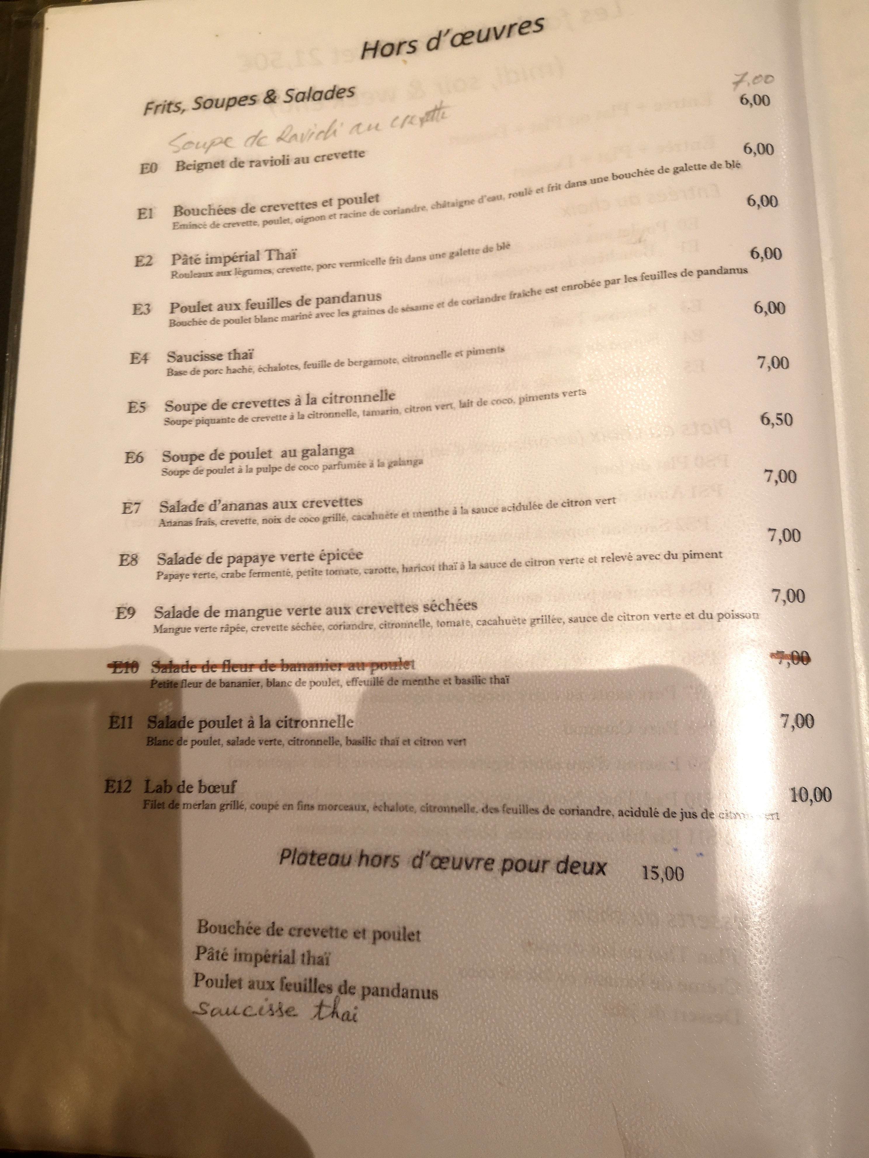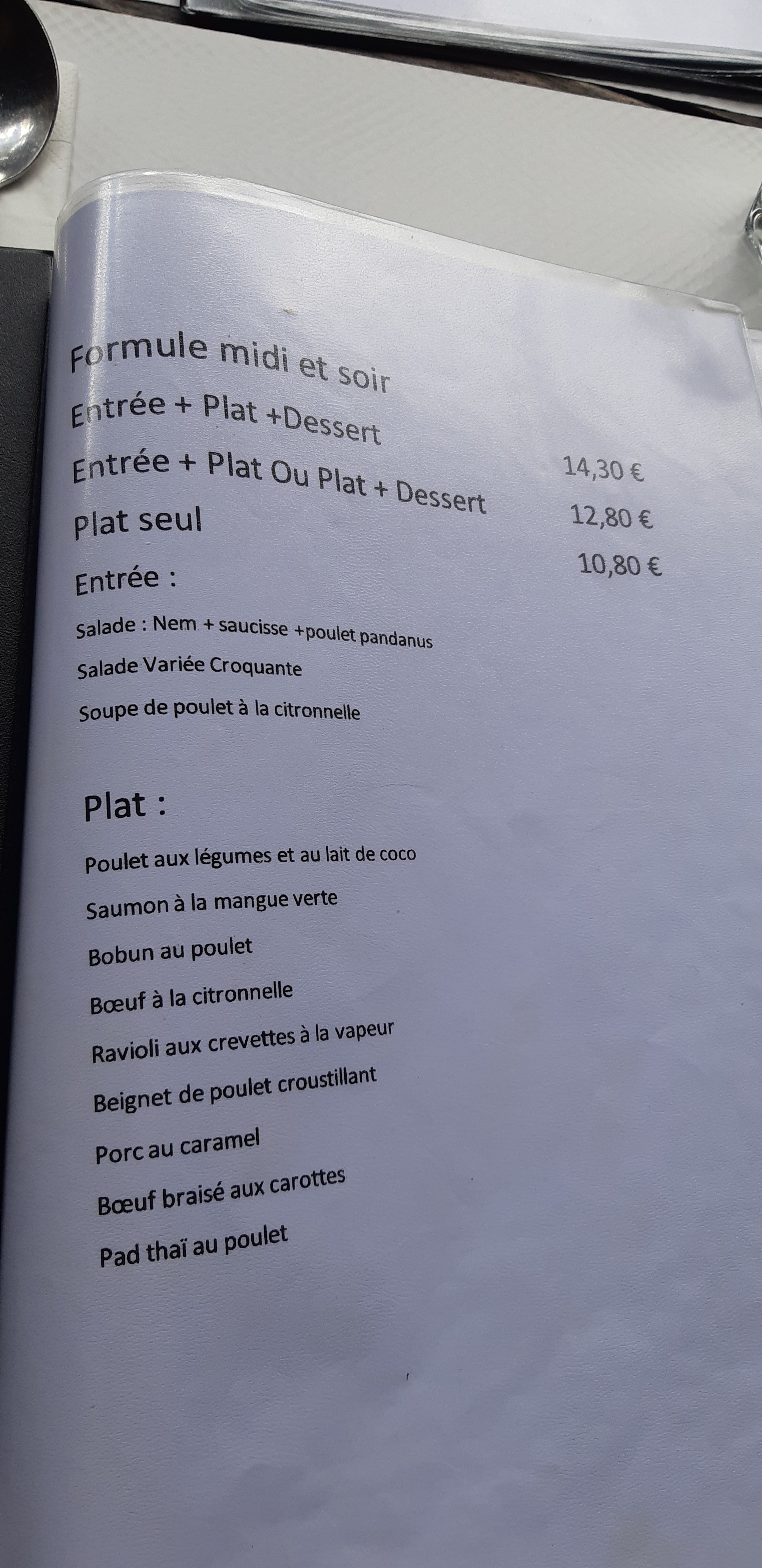 Je recommande le menu entre + plat : soupe de poulet et lait de coco avec poulet. Je le trouve super.