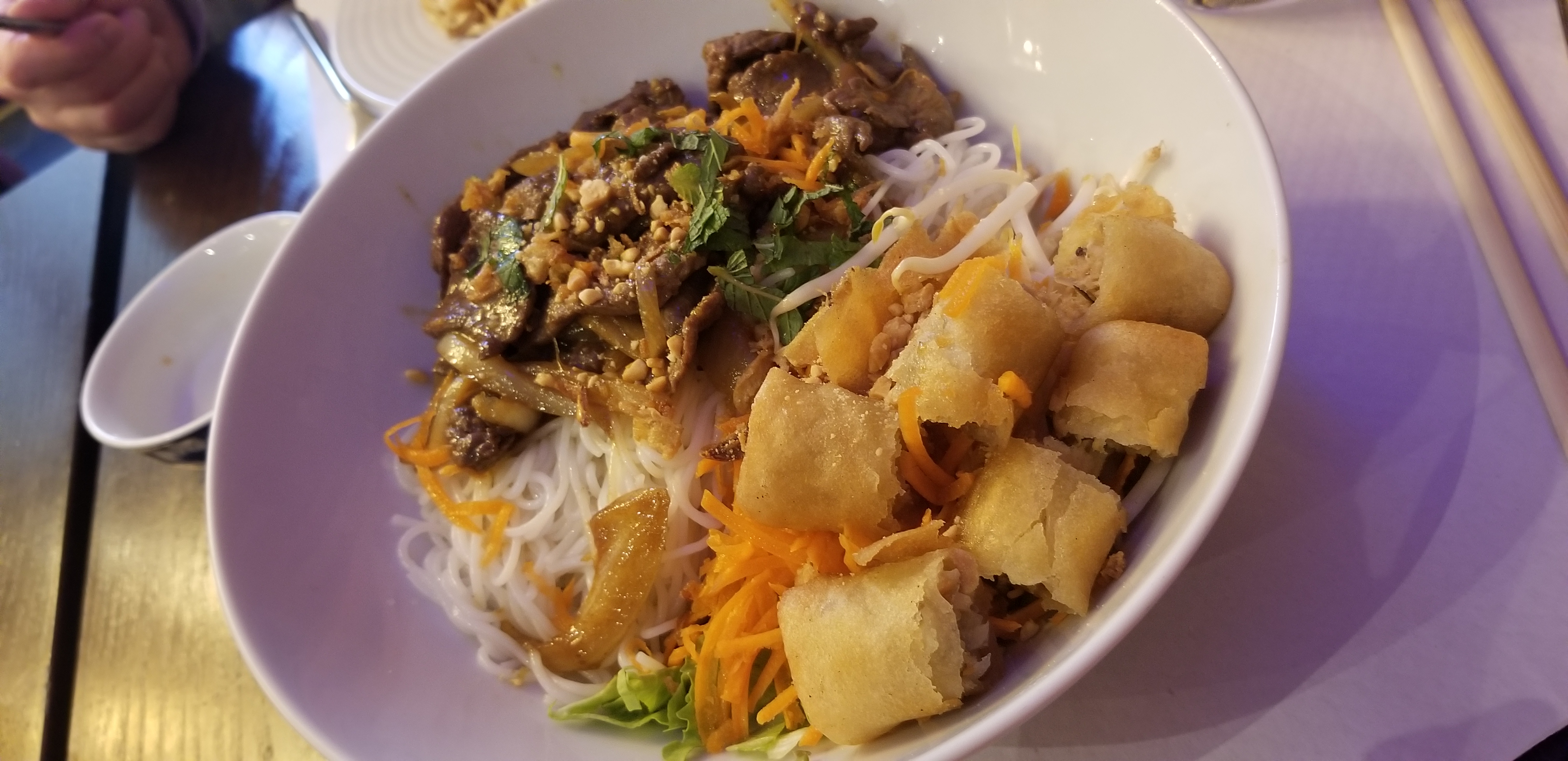 J'ai complètement oublié de faire la photo de la délicieuse entrée. Une salade croquante (je vous laisse la surprise). Je teste les bo bun partout et celui là est particulier car je trouve les nouilles un peu épaisses mais il reste très bon. Je recommande volontiers ce restaurant qui semble être tenu par un couple dynamique et aimable