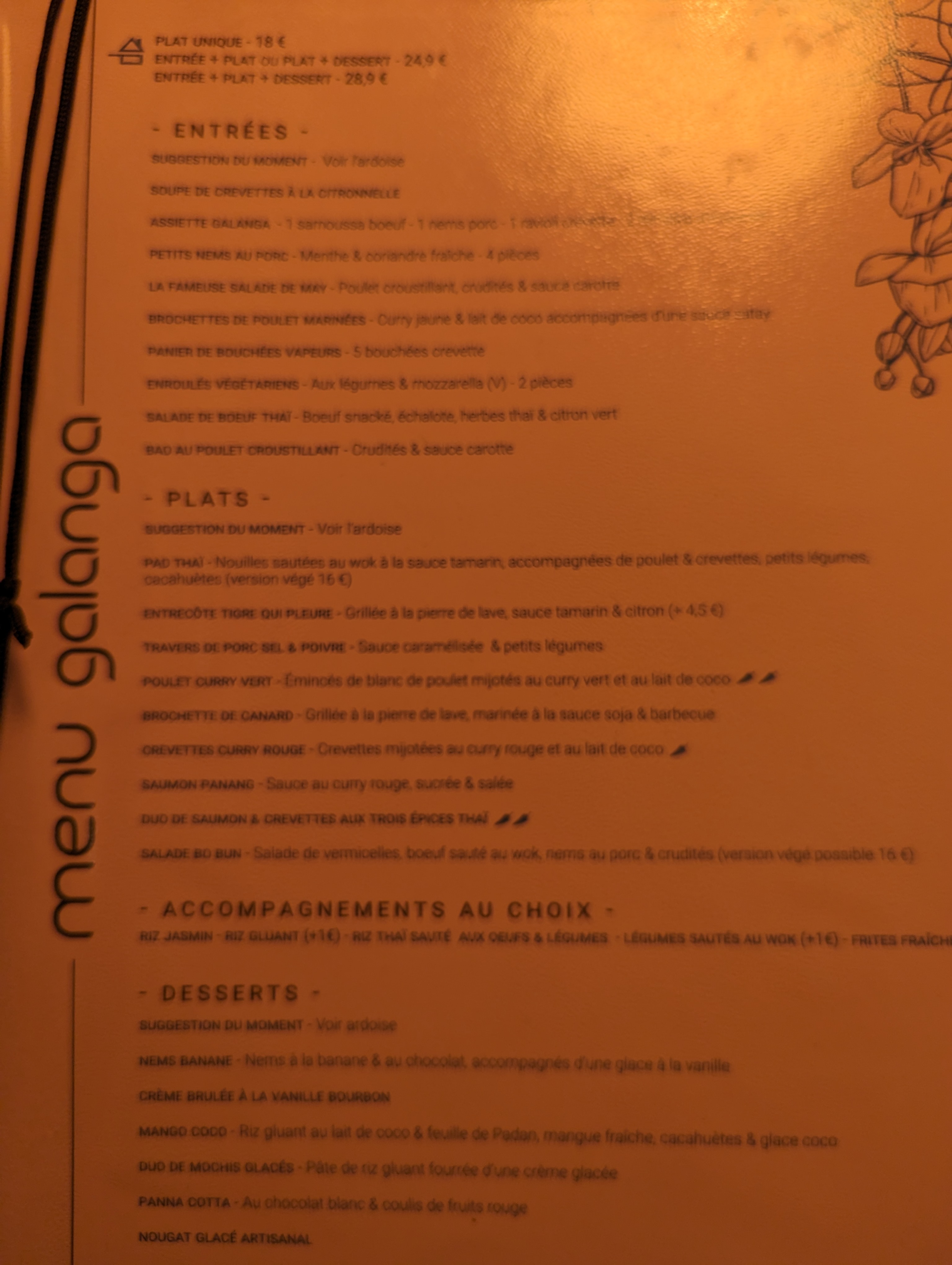 Les tables sont très serrées mais la déco est sympa. Nous avons choisi la formule entrée-plat avec apéro (kir) et un pichet de rouge (46cl Roussillon), en commandant l'assiette de Galanga et Pad Thaï (2 photos jointes). C'est bon mais les quantités sont modestes. La note à 75 euros pour 2 personnes....c'est un peu cher quand même. On met 4 étoiles car ce qu'on a mangé était bon.
