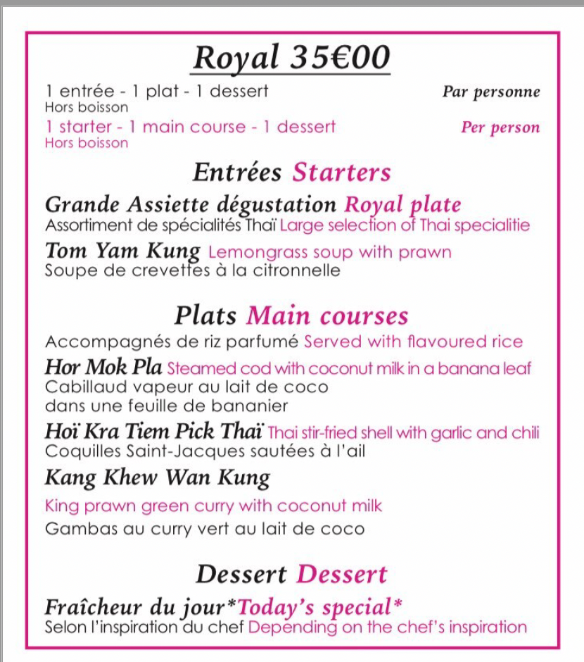 Posté le 02/08/2024 à 11:40"Le patron est Thaïlandais, la patronne est laotienne et la serveuse un mannequin 🤩 Ils sont accueillants et efficaces 👍 une cuisine authentique avec des plats savoureux et exquis 😋 être en terrasse en plein Paris pour déguster de vrais plats thaïlandais c’est royal 🙏 J’ai déjà réservé une table pour la semaine prochaine 🥰. 2e visite pour mon 🎂avec la famille : Papa qui a toujours une petite critique sur des plats asiatiques, nous le sommes et nous nous y connaissons, là il a trouvé tout très bon 👌 les patrons n’achètent que des produits de qualité et c’est une cuisine sans glutamate 👏🏻. Et à la fin du repas, j’ai eu droit à la musique de bon anniversaire et ce jolie bon flan coco avec la bougie en cadeau. Très délicate attention MERCI 🙏 et la petite serveuse belle comme le jour avec son sourire éclatant 🤩."
