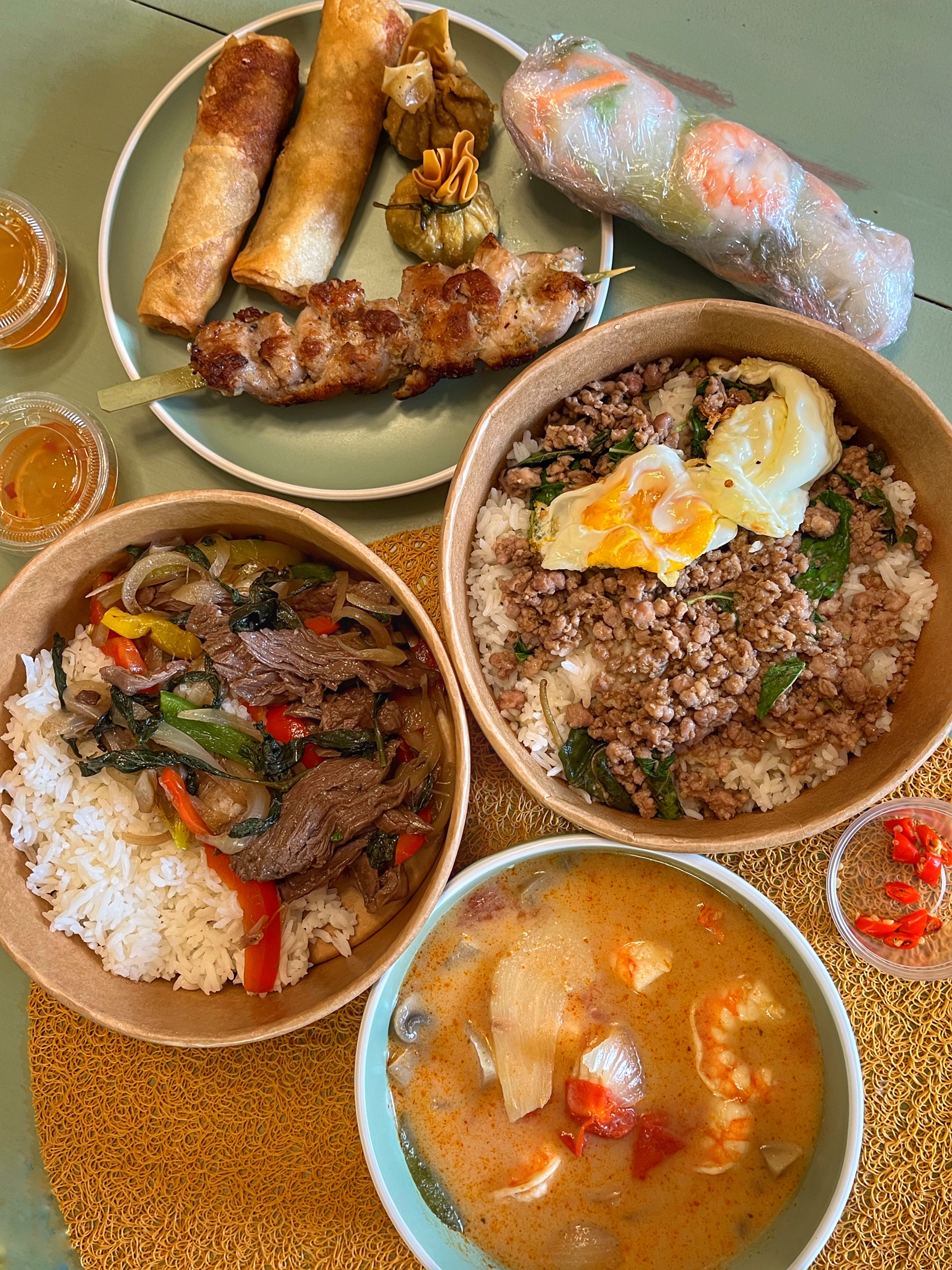 Posté le 17/06/2023 à 20:06"On recherchais les saveurs et épices de thailande que l'on a retrouvé dans la soupe coco et la salade de papaye verte Le boeuf basilic , les rouleaux de printempset et les samoussa légumes n'ont pas les saveurs thai mais sont tres bon On aimerait retrouver plus d'épices :-)"