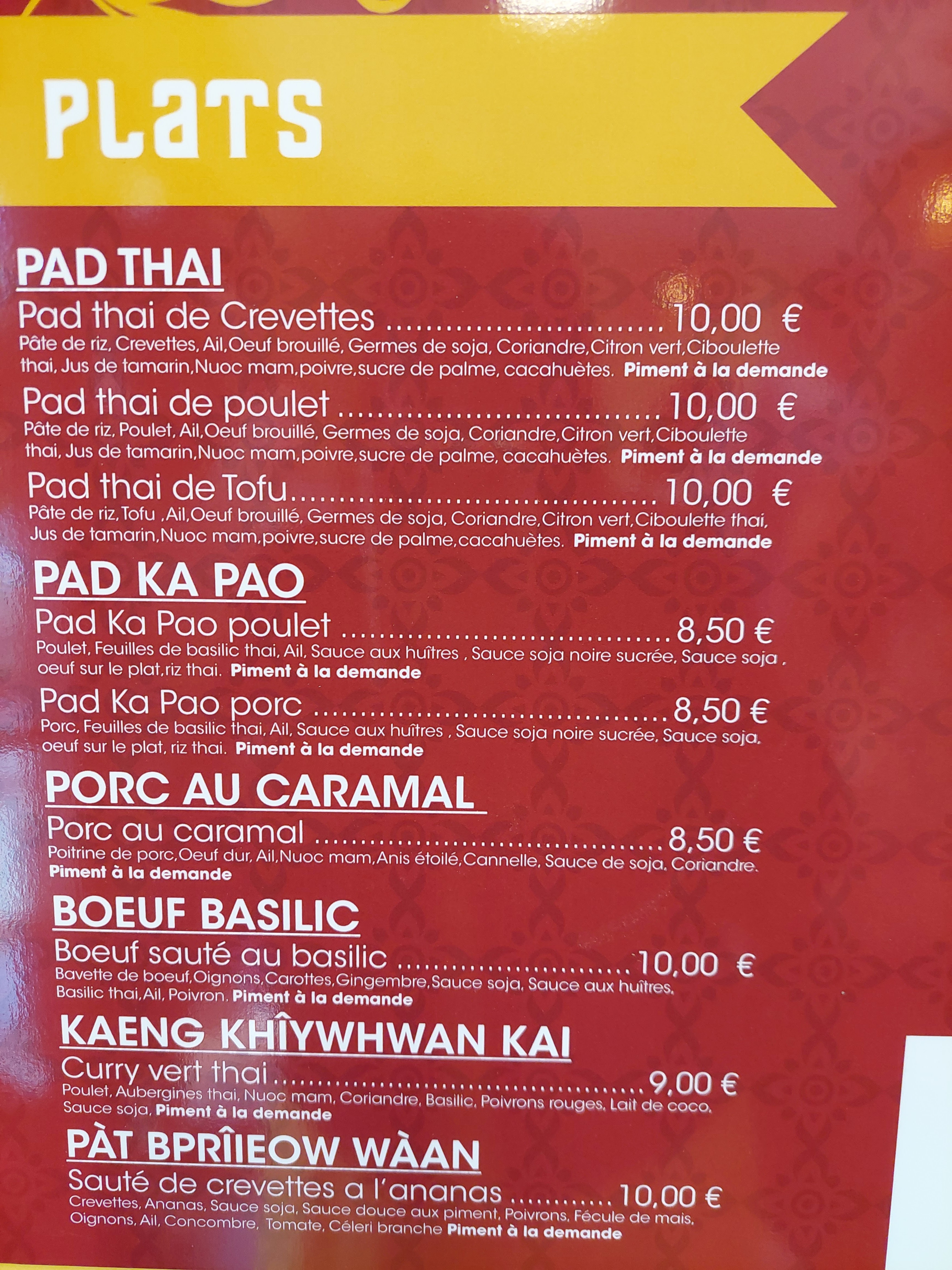 Excellent service sympathique, la nourriture était de très bonne qualité en termes de fraîcheur. Nous voulions essayer cela depuis que nous avons quitté le Royaume-Uni pour la France. Nous avons également voyagé à plusieurs reprises en Thaïlande et savons à quoi devraient ressembler les plats. Je dirais que tous les plats manquaient de piments birdeye car un Thaïlandais devrait avoir plus de piquant. Je sais que pour répondre aux goûts français, cela ne serait peut-être pas possible. Le pad Thai était délicieux et est un favori personnel, peut-être donner au client le choix s'il veut des piments frais cuits avec le plat ou non lors de la commande peut être une excellente idée. Nous reviendrons certainement et nous assurerons de demander que nous voudrions les plats cuisinés avec du piment et que nous ayons la chaleur qui manquait aux plats.