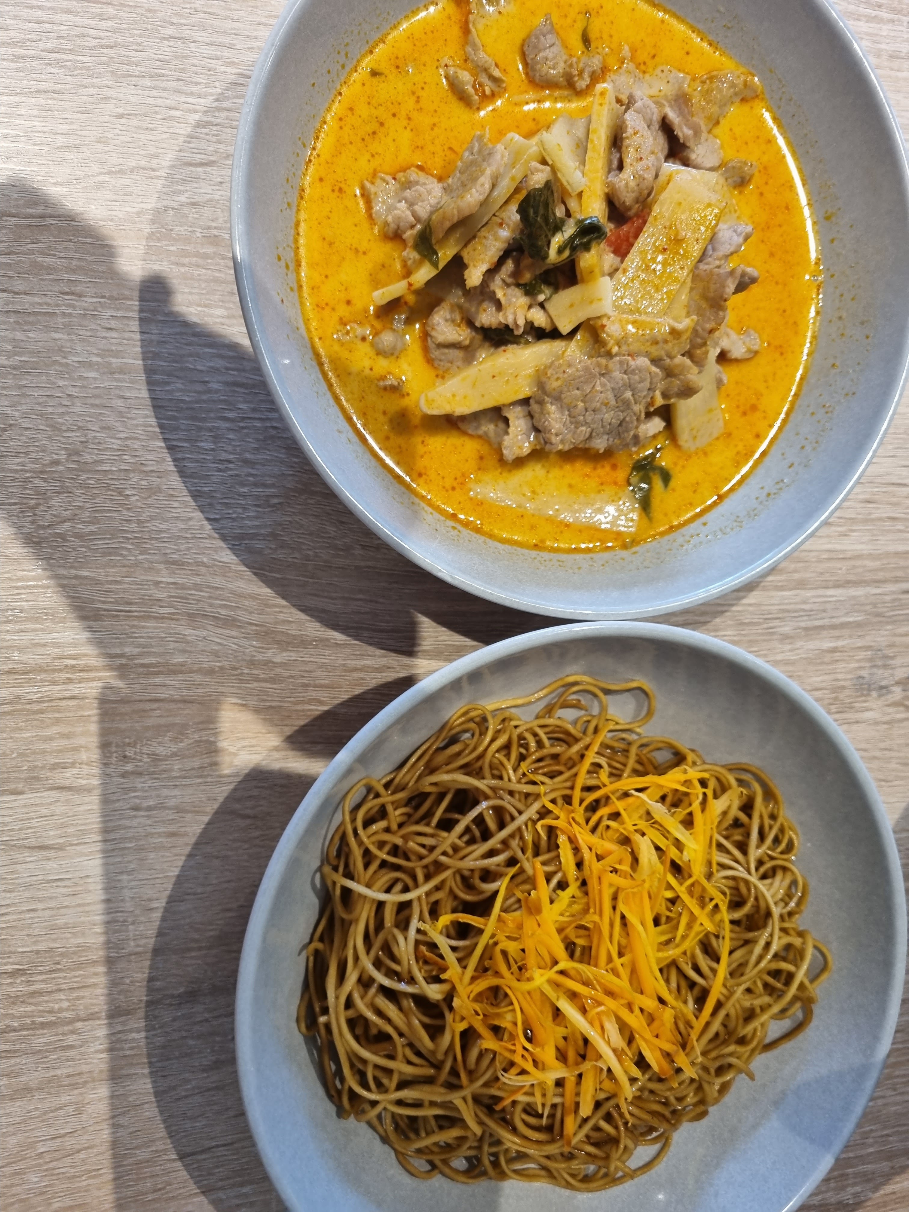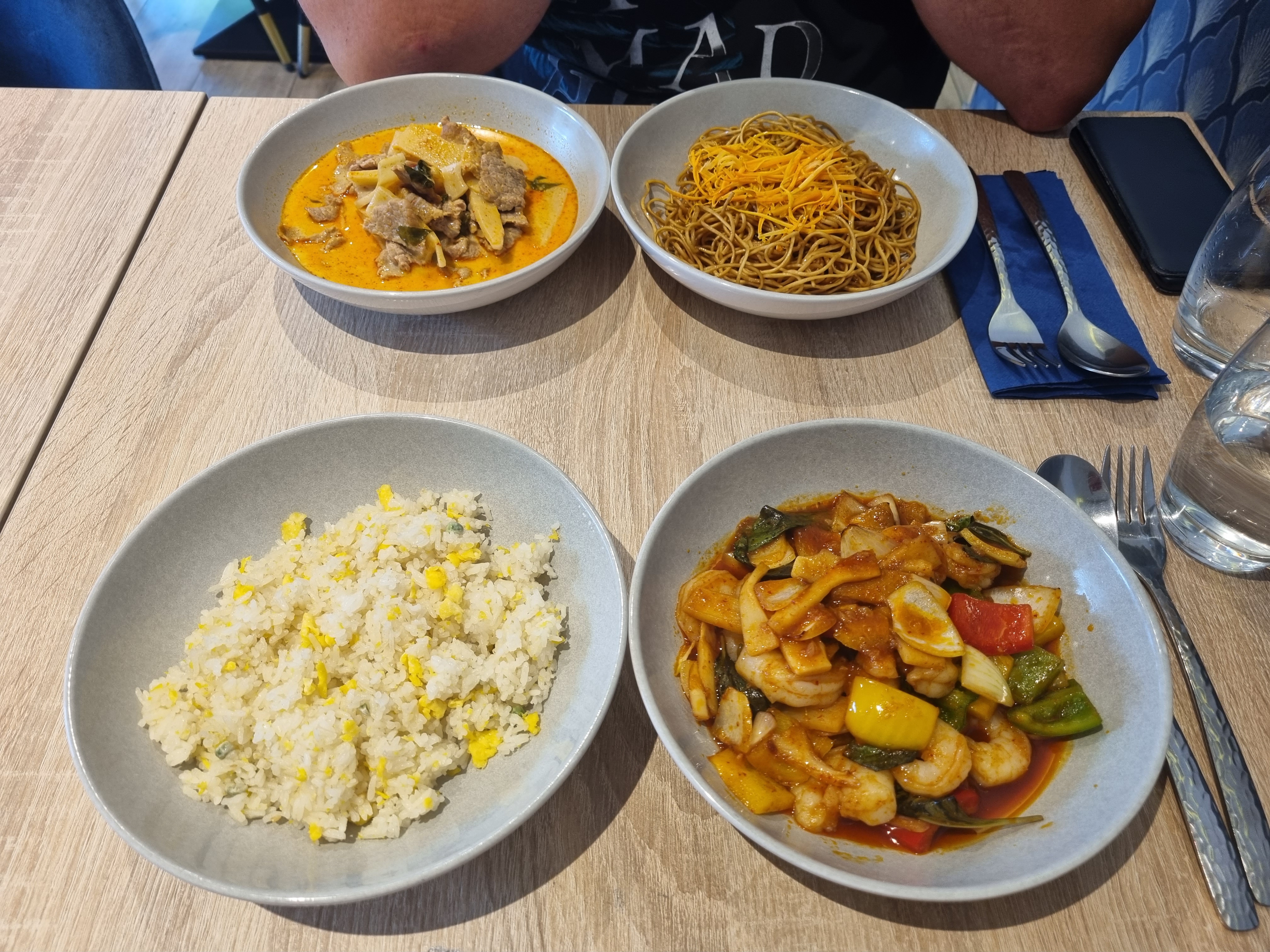 Un régal. Les épices sont très bien dosé (bœuf thaï au curry rouge et crevettes au curry vert). Sauce peut être un peu trop liquide. Petit conseil: plonger ses nouilles et son riz dedans. Les beignets aux crevettes, une vraie petite tuerie (pâte à beignet aérienne comme il faut). Seul petit bémol : il y a eu confusion sur la commande passée par internet. Nous voulions en livraison et ils pensaient que c'était à emporter. Je crois que ce n'est pas encore au point mais comment leur en vouloir alors qu'ils sont ouverts que depuis deux mois environ. On n'en a jamais assez 😊 c'était un bon repas !
