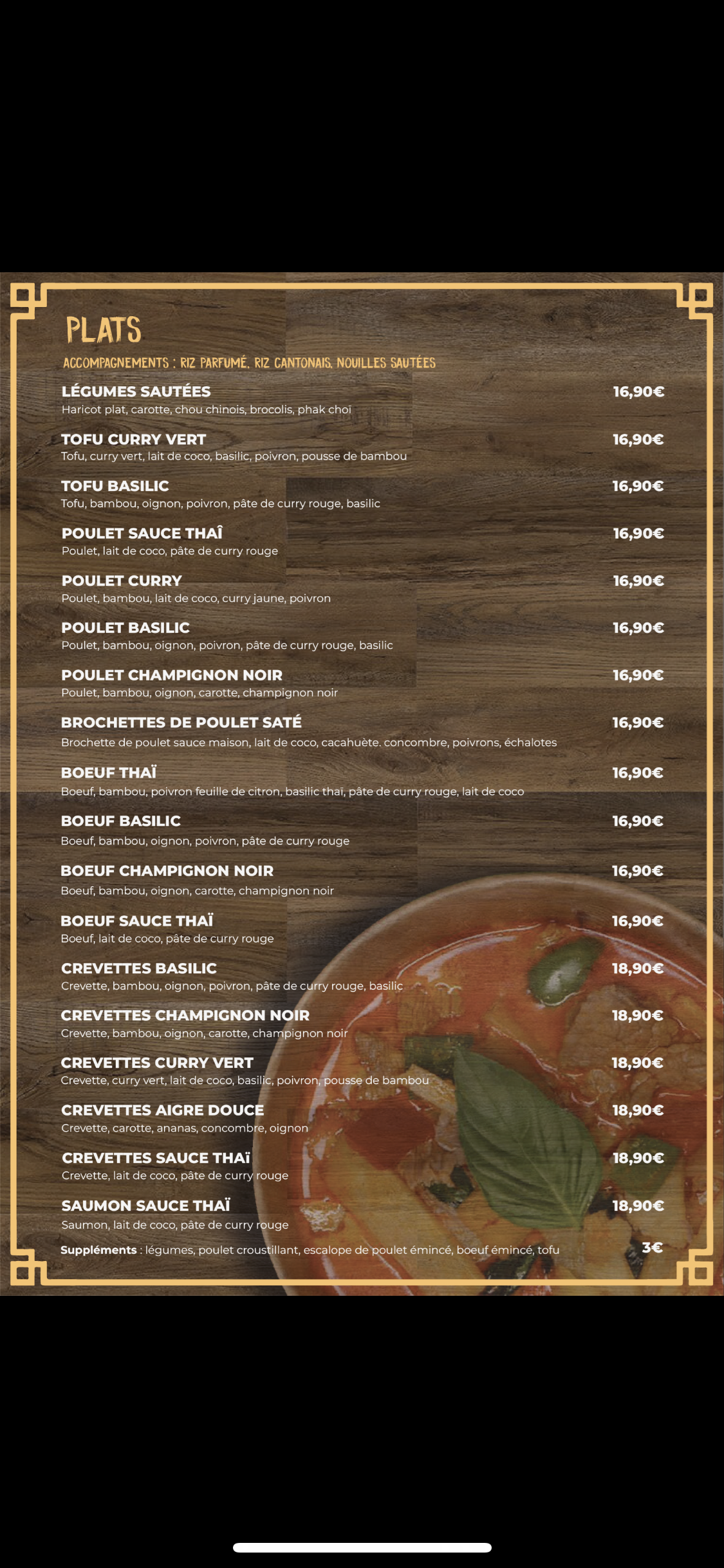 Restaurant Thaï et Laotien avec une gamme de prix de 8 à 15 euros pour un plat. Possibilité de box avec boisson. Bien servi et accueil agréable. A emporter ou livraison. Testez !