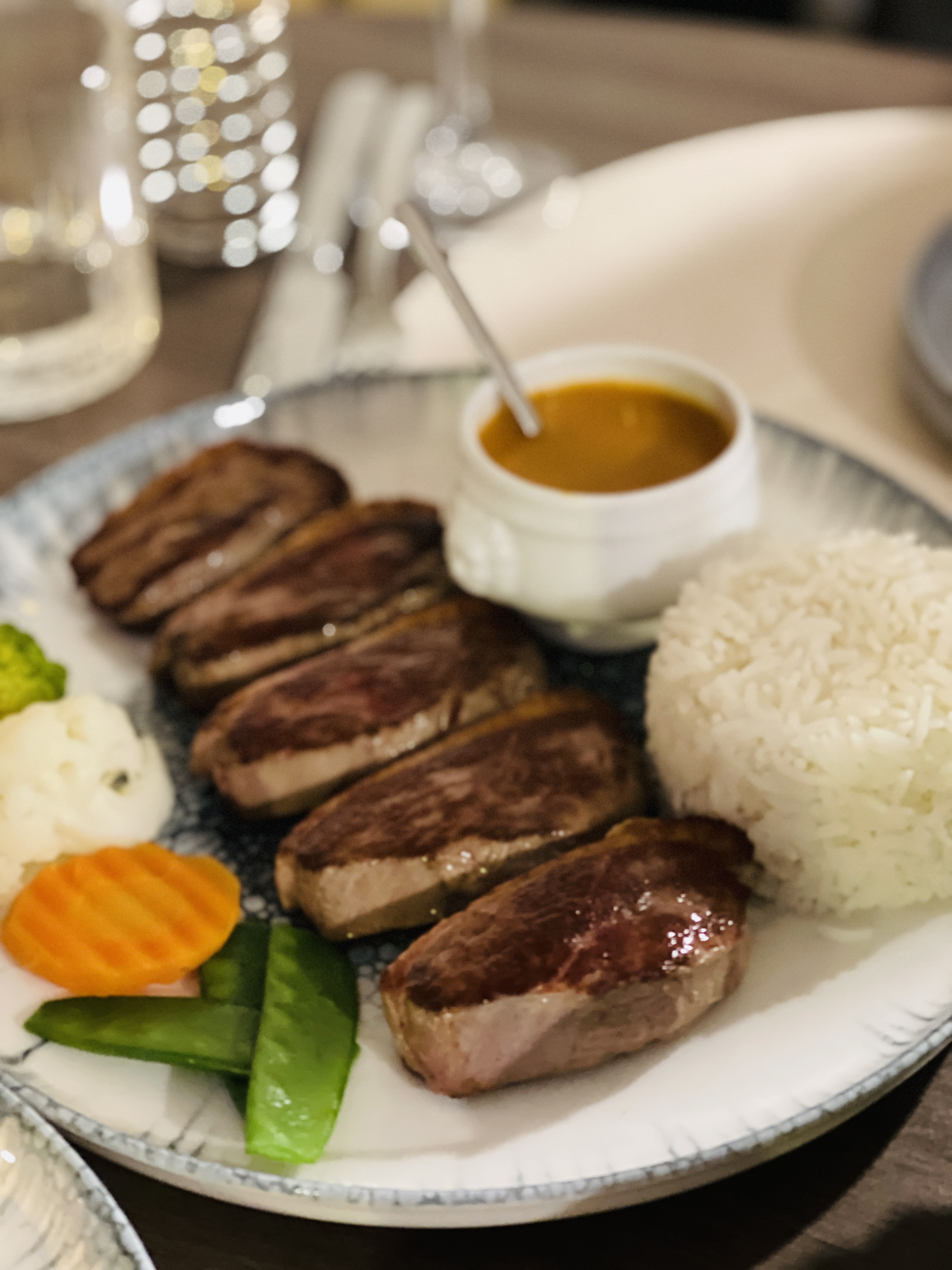 Nous sommes arrivés dans ce restaurant car tout les autres étaient pleins avec le marché de noël. On étaient contents d’avoir trouvé une place au chaud ici! Accueil sympa! L’entrée était très bonne on a prit les bouchons au bœuf et la soupe aux ravioles de crevettes! Le plat « Le tigre qui pleure » était pour mon mari une déception, en effet on s’attendait à du bœuf saignant mais quand même pas du cru! Mon plat le canard avec son riz et ses légumes accompagné d’une sauce était correcte. La sauce était excellente mais vraiment trop trop bonne mais il y en avait trop peu………………. Petite déception de ce fait ainsi que les 4 légumes surgelés qui se battent en duel sans assaisonnement, il y avait la sauce mais bon si on voulait en tartiner sur la viande plus sur le riz. Donc soit assaisonner les légumes soit mettre le double de sauce! On a pas goûté les desserts donc je n’ai pas d’avis à donner dessus. C’était en général correcte on en a eu pour 54 euros entre les plats et boissons ainsi qu’un café. Mais ce n’est pas le meilleur restaurant vietnamien qu’on ai fait dans notre vie pour autant. On encourage cependant les personnes en cuisine et au service à poursuivre leur efforts car il y a du potentiel! Ah! Aussi un petit plus à apporter au restaurant… Au niveau de la décoration c’est un peu impersonnel, donc mettre des petites lumières tamisées, un peu de pierres au mur comme sur un côté sur lequel c’est déjà présent, mettre davantage de tableaux ou de décoration pour rendre l’endroit accueillant, ça c’est un plus mais quand on rentre les lumières froides au plafond ça fait plus cabinet dentaire que restaurant, des petits détails qui peuvent faire une petite différence. Pour ceux qui ont lu mon commentaire jusqu’au bout… Merci lol