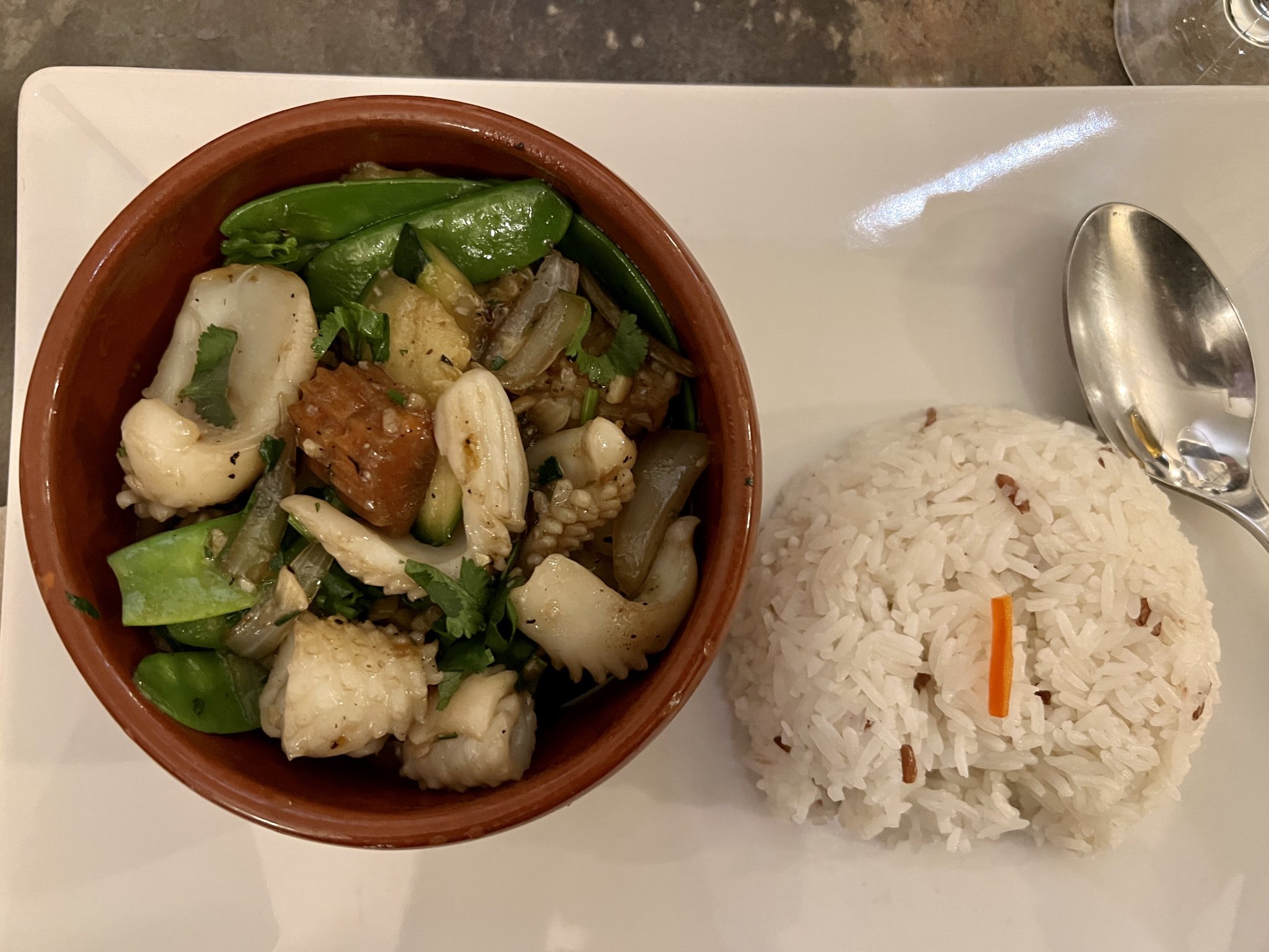 Déçue par le manque de saveurs, les épices et herbes thaïlandaise ne sont pas au rendez-vous, plat tiède,...très moyen et cher pource qui est dans l'assiette..