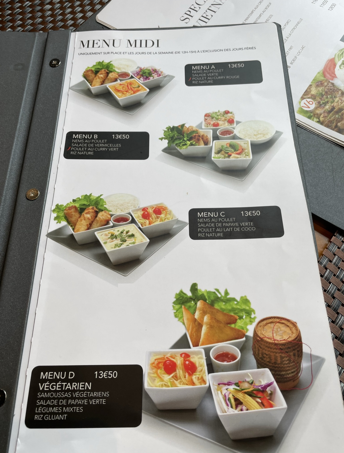 Correct mais sans plus, pas vraiment un bon rapport qualité prix Les quantités sont vraiment toutes petites J’ai pris un cabillaud au lait de coco avec un riz gluant qui m’a coûté 21€ mais qui faisait la taille d’une entrée , servi dans une petite assiette, c’était moins copieux que le menu enfant !