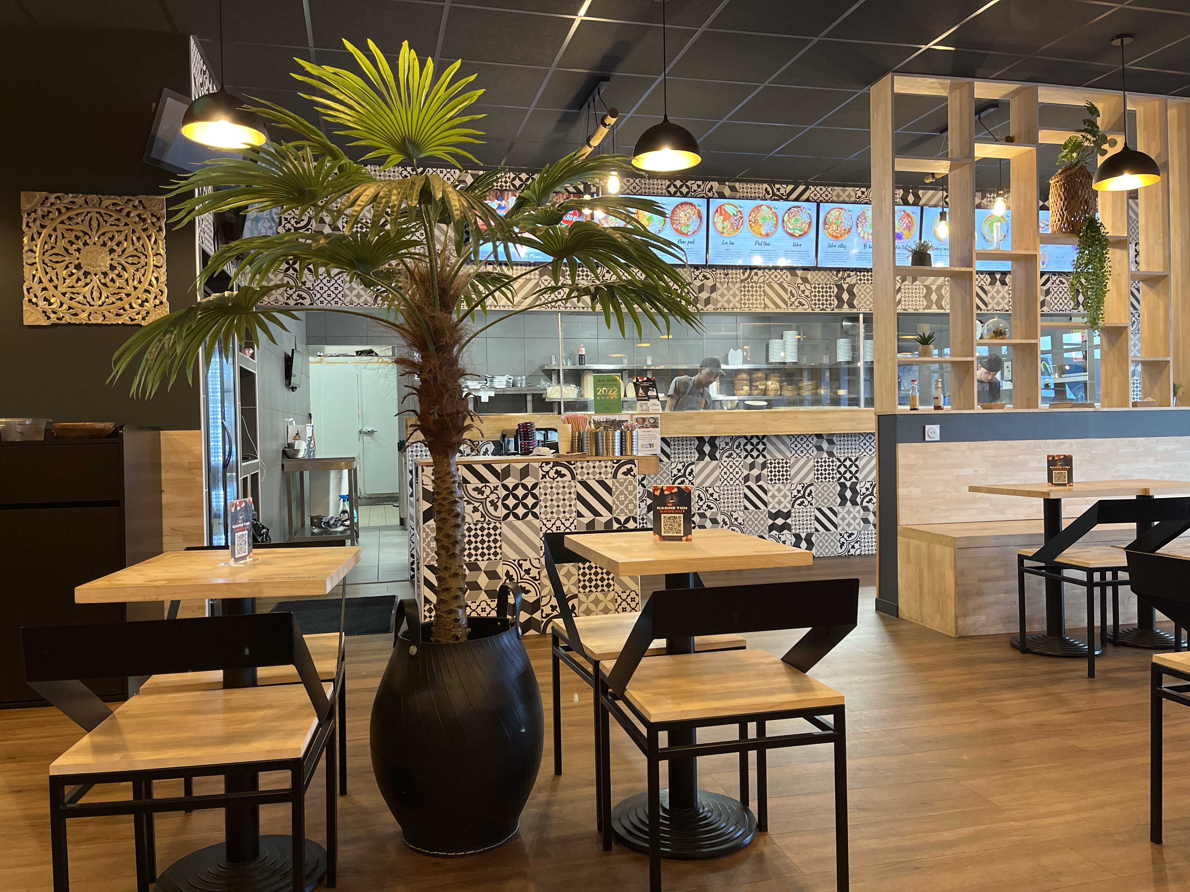 Très bon et original. Pour manger en petit groupe la salle est très agréable. Il est aussi possible de prendre a emporter. Les bols sont modifiables si certains ingrédients sont problématiques et il est possible de choisir la quantité d'épices dans le plat. De 0 a 4 en niveau d'épices. J'ai pris niveau 2 et c'était plutôt doux. D'autres de mon groupe on pris niveau 1 et on trouvé un peu trop épicé.