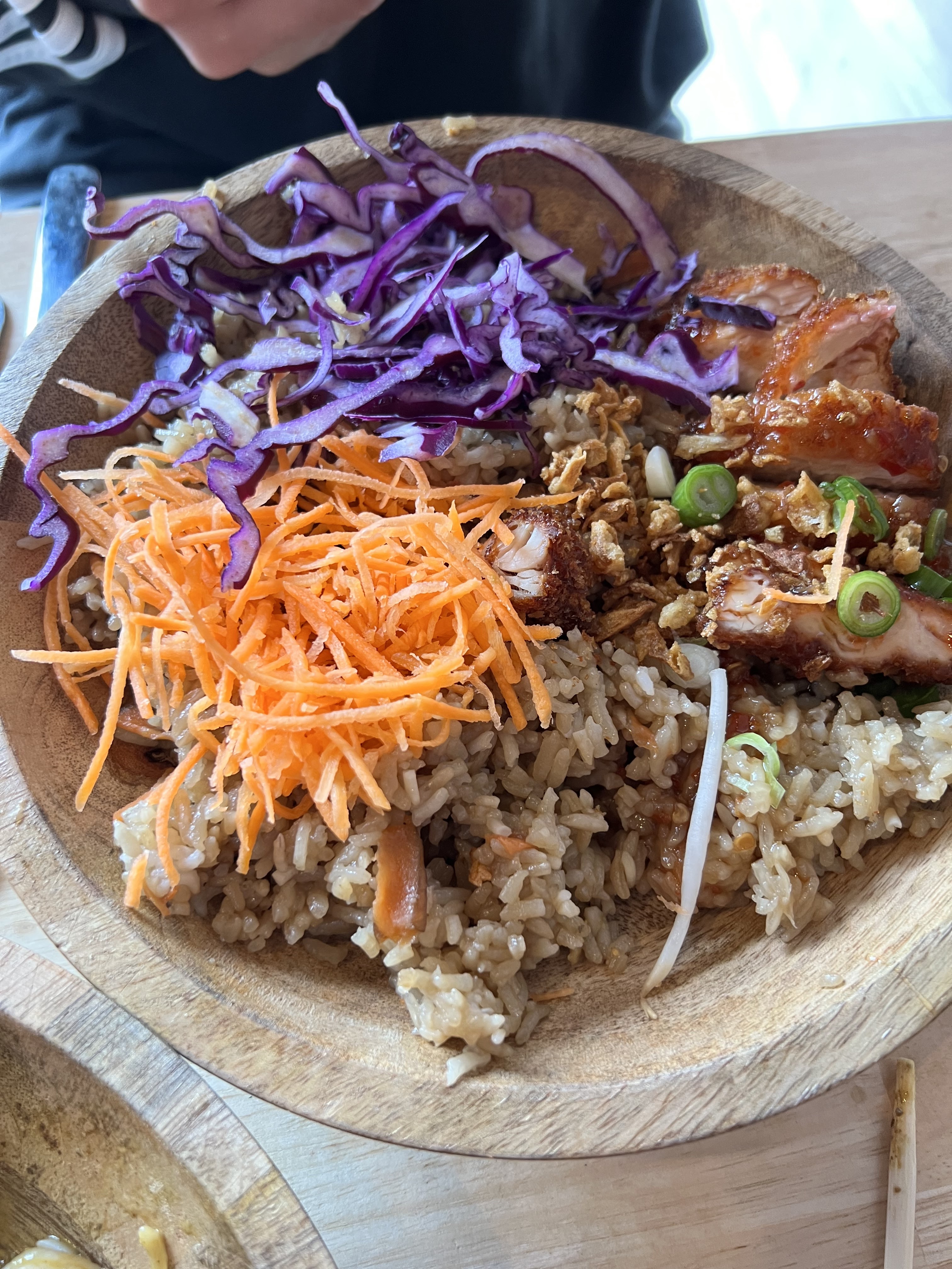 Des bowls super copieux , les tables sont collantes en fin de journée.....problème de résine sur le bois je pense. Bien accueilli et l attente est moyenne.
