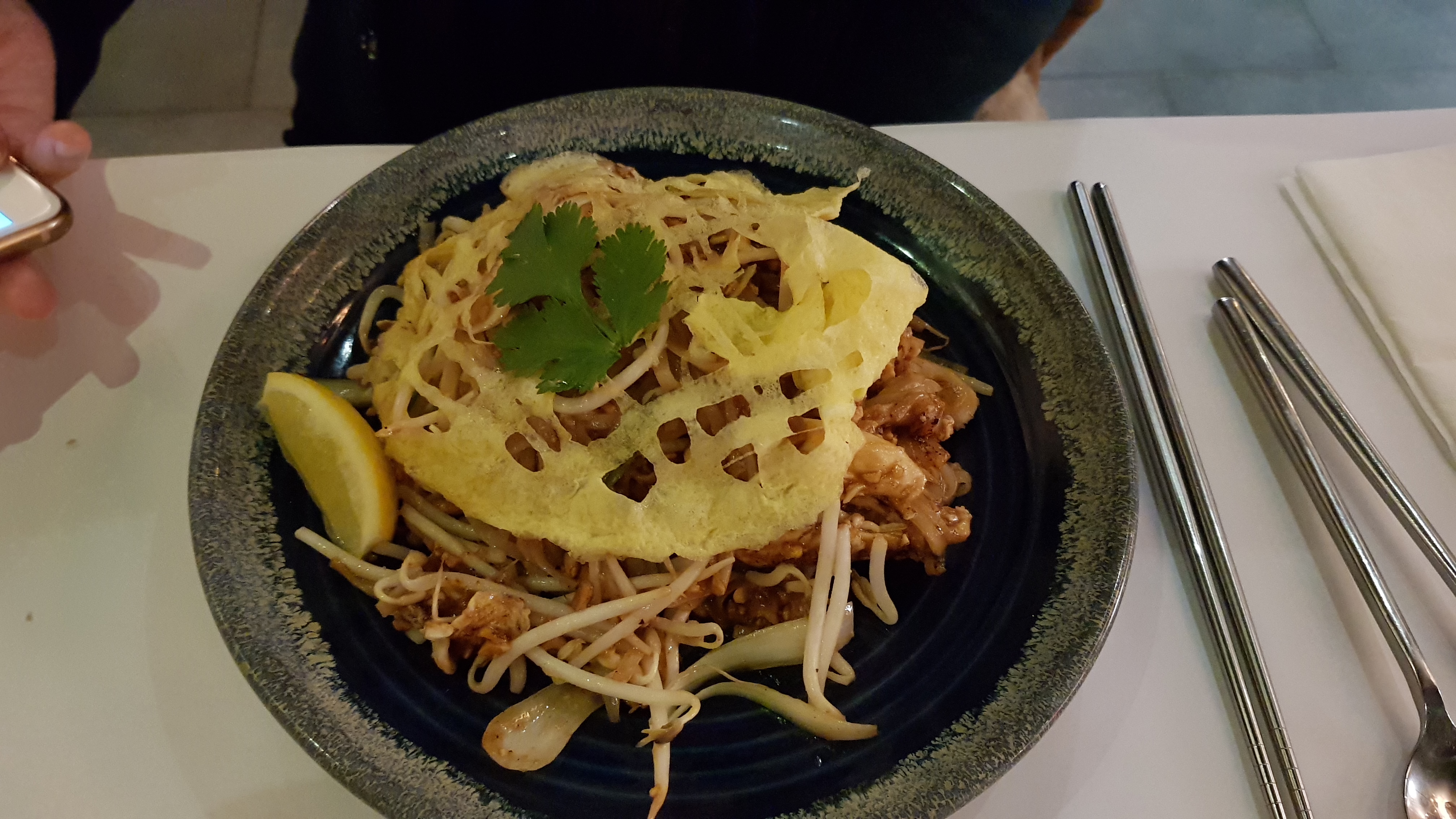 Pad thaï très bon. Même si 1 ou 2 crevettes de plus auraient été les bienvenues... il m'est arrivé un petit désagrément mais rien de grave pendant le repas et le serveur nous a gentiment offert le dessert. Très sympa !