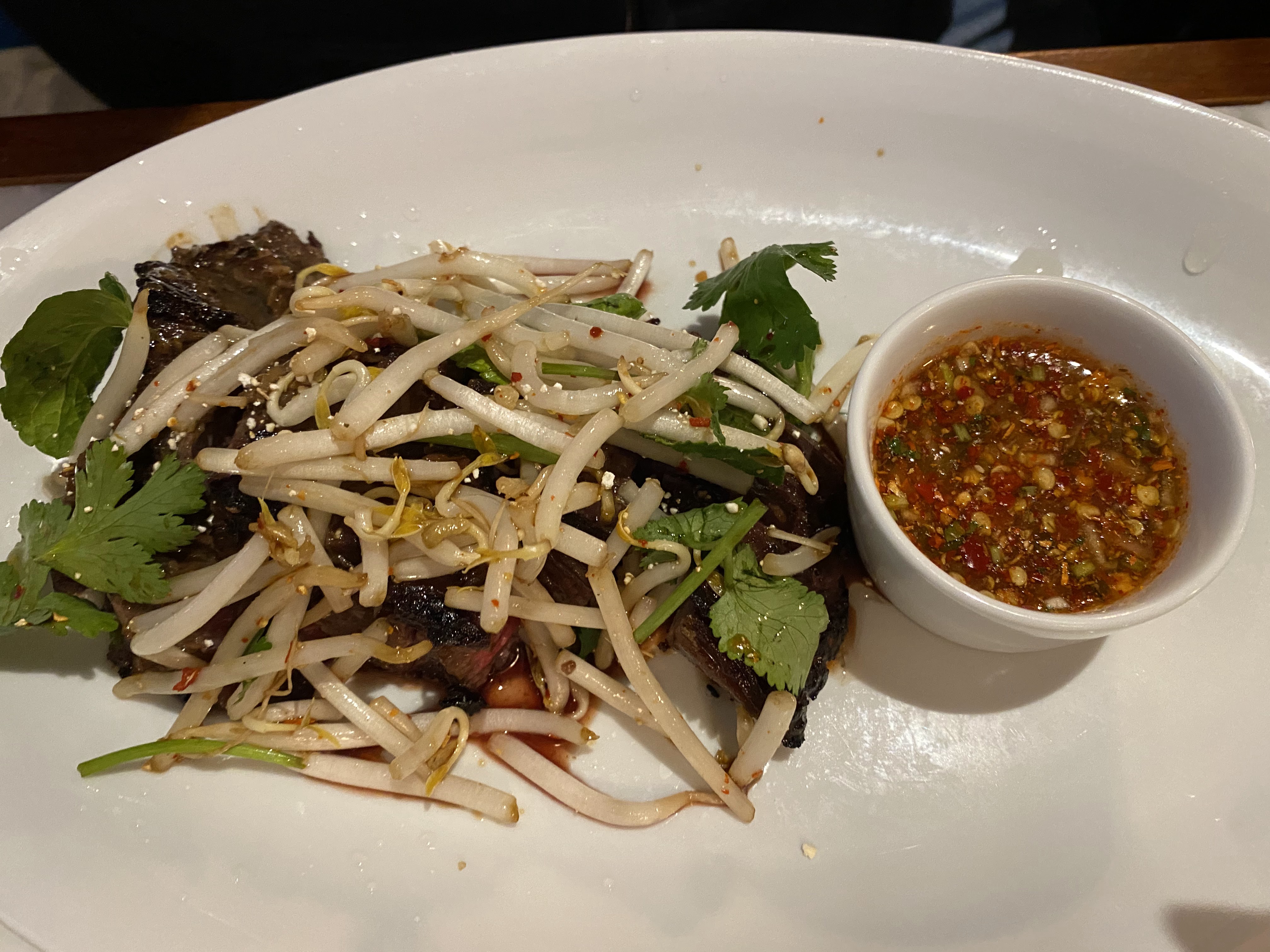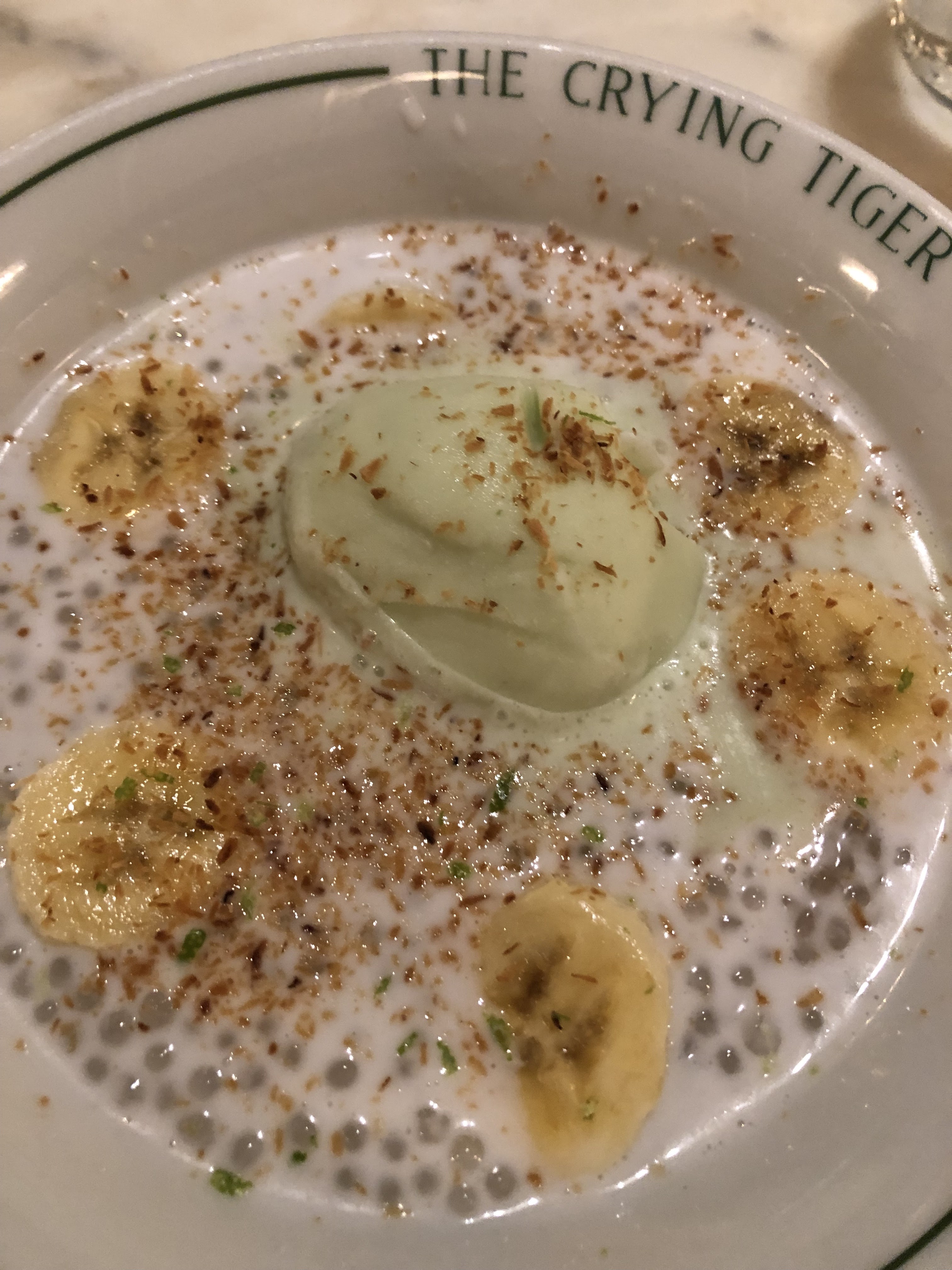 Les brochettes de poulet en entrée étaient très bonnes, leur spécialité : le “crying tiger” était excellent et pour fini leur dessert « perles du Japon sorbet coco-pandan avec bananes fraîches et lait coco était léger, délicieux et parfait pour bien terminer ce repas thaï ! Je recommande.