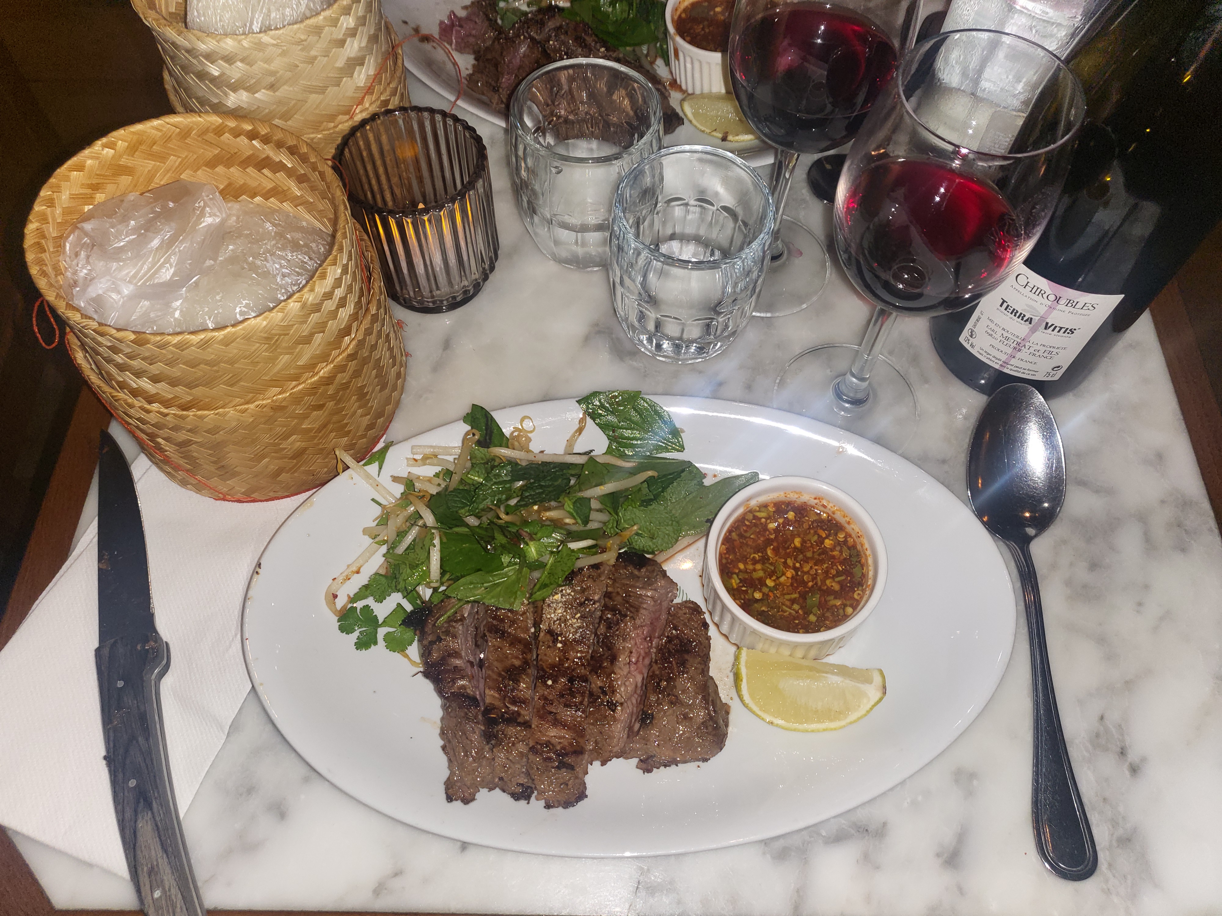 Super expérience Serveuse très sympathique Nourriture délicieuse (saucisse de porc citronnelle en entrée, curry de poisson, tigre qui pleure, perle du japon et expresso) Petit bémol sur le vin rouge qui était servi quasi chaud en raison de la chaleur (à 6.5 e le verre de 12.5cl on peut au moins l'espérer tiède et même idéalement un rien frais) Le chablis (10e le verre) est somme toute très banal pour un verre si cher En somme, les prix dans ce restaurant sont assez chers mais la qualité est vraiment là sur la nourriture, sur le vin c'est moins le cas.