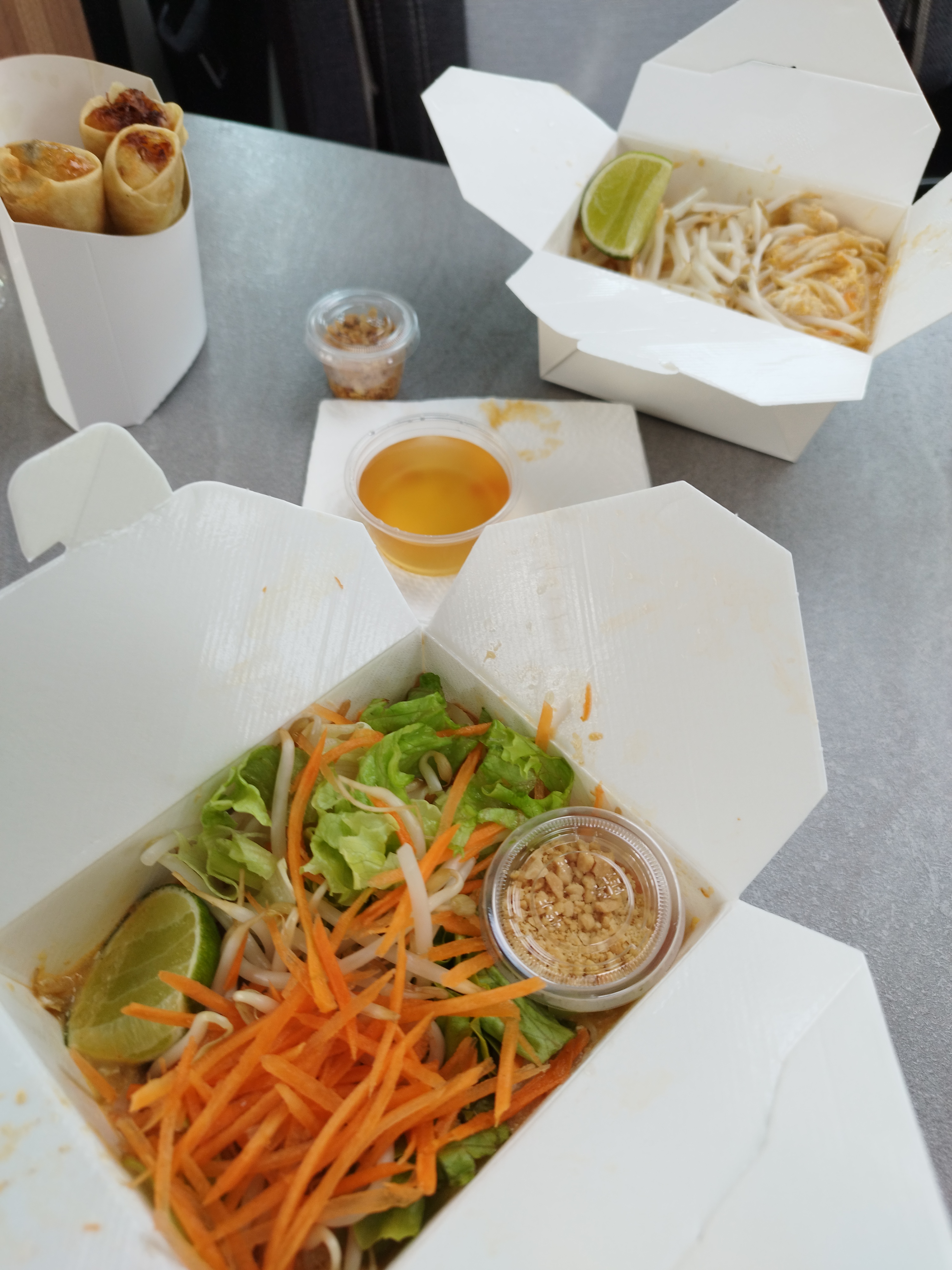 Excellente nourriture fraîchement préparée à un prix plus juste. Nous avons eu 1x rouleau de printemps aux légumes (Nems légumes, 4 pièces), des nouilles de riz aux légumes (Pad Thai Légumes) et des nouilles de riz au poulet (Pad Thai Poulet). C'était parfait… Addenda septembre 2023 C'était encore une fois super savoureux et fraîchement préparé. La nourriture est vraiment fortement recommandée et le prix est vraiment bon marché pour un tel délice.